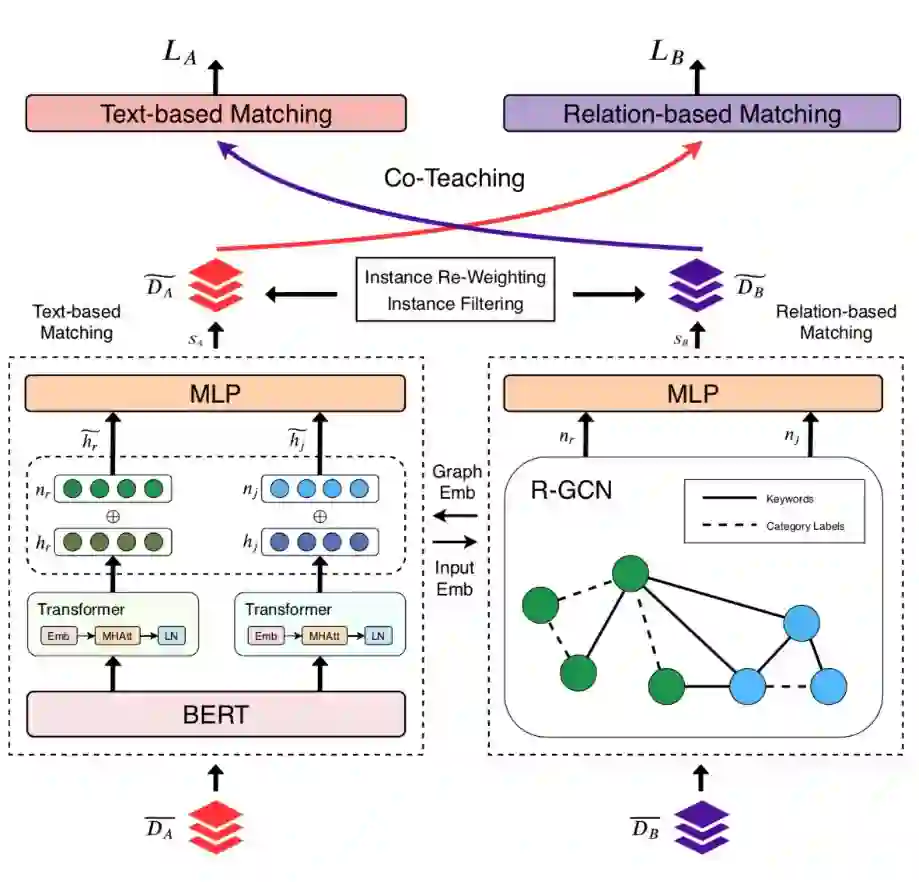 论文概述:随着在线招聘规模的不断增长,求职领域下的人岗匹配已经成为最重要的任务。人岗匹配任务通常可以看作文本匹配问题。当监督数据足够多时,模型的学习效果是有用的。但是在线招聘平台上,职位和简历的交互数据稀疏且带有噪声,这会影响求职简历匹配算法的性能。为了缓解这些问题,本文提出了一种多视图协同教学网络用来解决人岗匹配中的数据稀疏和噪声问题,匹配网络包含两个主要模块,即基于文本的匹配模型和基于关系的匹配模型。这两个部分在两个不同的视图中捕获了语义信息并且相互补充。为解决数据稀疏和噪声数据带来的挑战,我们设计了两种特定策略。首先,两个模块共享学习的参数和表示,以增强每个模块的初始的表示。更重要的,我们采用了一种协同教学的机制来减少噪声对训练数据的影响。核心思想是让这两个模块通过选择更可靠的训练实例来互相帮助。这两种策略分别关注于表示增强和数据增强。与基于纯文本的匹配模型相比,所提出的方法能够从有限的甚至稀疏的交互数据中学习更好的表示,对训练数据中的噪声具有一定的抵抗能力。实验结果表明,我们的模型均优于现有的方法。