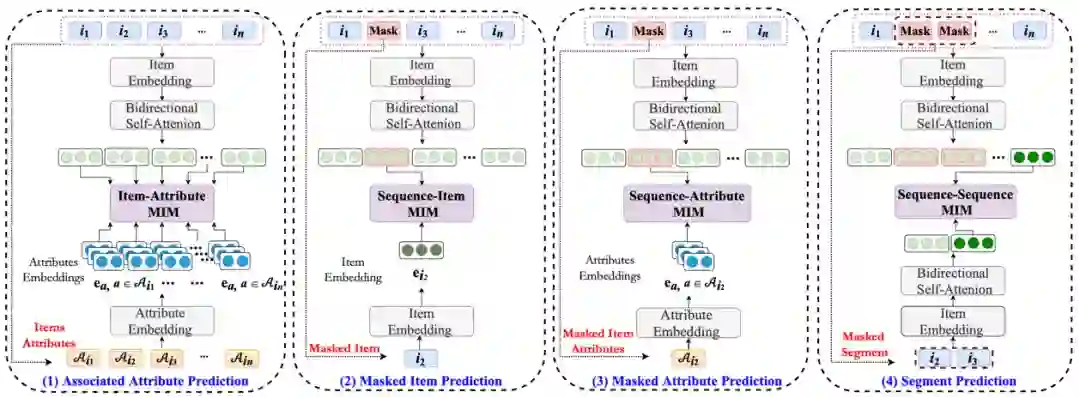 论文概述:近年来,深度学习在序列化推荐领域取得了巨大成功,已有的序列化推荐模型通常依赖于商品预测的损失函数进行参数训练。但是该损失函数会导致数据稀疏和过拟合问题,其忽视了上下文数据与序列数据之间的关联,使得数据的表示学习的并不充分。为解决该问题,本文提出了S3-Rec这一模型,该模型基于自注意力是模型框架,利用四个额外的自监督训练函数来学习属性、商品、序列之间的特殊关系。在这里,本文采用了互信息最大化技术来构造这些自监督函数,以此来统一这些关系。在六个数据集上的充分实验表明本文提出的模型能够取得State-of-the-art的效果,其在数据量受限和其他推荐模型上也能带来较大的提升。