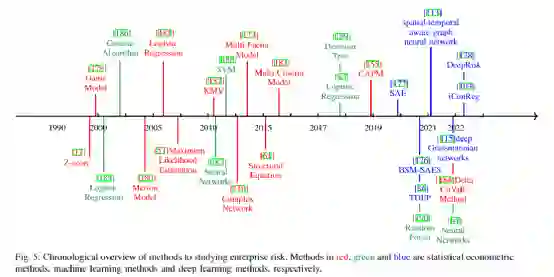 3.方法部分 我们在方法论部分介绍了研究企业风险使用的三大类方法,即统计模型、机器学习模型和深度学习模型,还有一部分是三种模型的混合。我们在这里统计了各个年份的出版情况,并且根据重要文献的模型绘制了时间轴。