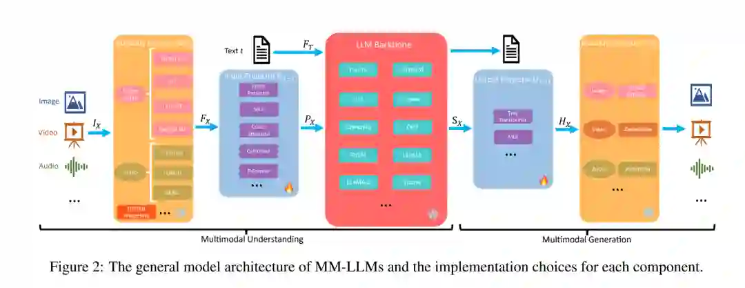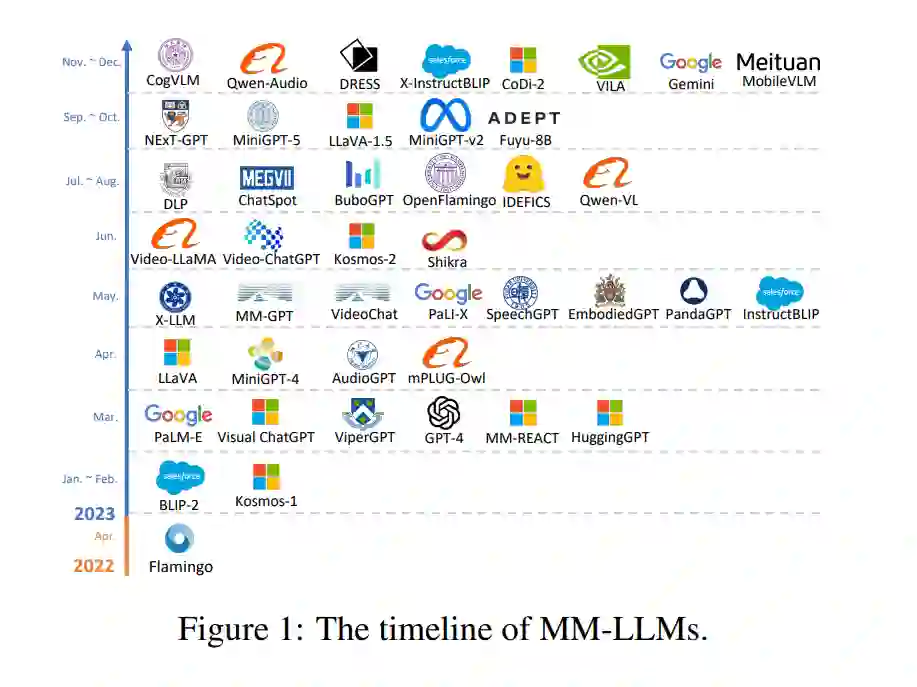 MM-LLMs的时间线如图1所示。在这篇论文中,我们提供了一份全面的综述,旨在促进对MM-LLMs的进一步研究。为了让读者全面理解MM-LLMs,我们首先从模型架构(第2节)和训练流程(第3节)概述了一般设计公式。我们将一般模型架构分解为五个部分:模态编码器(第2.1节)、输入投影器(第2.2节)、LLM骨干(第2.3节)、输出投影器(第2.4节)和模态生成器(第2.5节)。训练流程阐述了如何增强预训练的仅文本LLM以支持多模态输入或输出,主要包括两个阶段:多模态PT(第3.1节)和多模态IT(第3.2节)。在这一部分,我们还提供了多模态PT和IT的主流数据集概述。接下来,我们讨论了26种最先进(SOTA)的MM-LLMs,每种都有其特定的公式化,并在第4节总结了它们的发展趋势。在第5节中,我们全面回顾了主要MM-LLMs在主流基准测试上的表现,并提炼了增强MM-LLMs效能的关键训练秘诀。在第6节中,我们提出了MM-LLMs研究的有希望的方向。此外,我们建立了一个网站(https://mm-llms.github.io)来跟踪MM-LLMs的最新进展,并促进众包更新。最后,我们在第7节总结了整篇论文,并在附录A中讨论了与MM-LLMs相关的综述。我们希望我们的综述能帮助研究人员更深入地了解这一领域,并激发设计更有效的MM-LLMs。