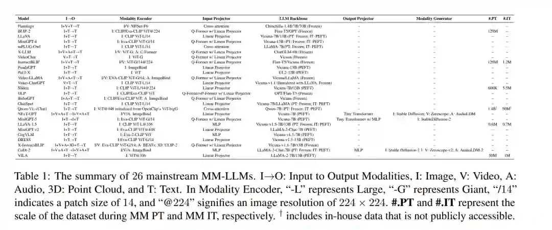 根据之前定义的设计公式,我们对26个SOTA MM-LLMs的架构和训练数据集规模进行了全面比较,如表1所示。随后,我们将简要介绍这些模型的核心贡献,并总结它们的发展趋势。 (1)Flamingo(Alayrac et al., 2022)代表了一系列用于处理交错的视觉数据和文本、生成自由格式文本输出的视觉语言(VL)模型。 (2)BLIP-2(Li et al., 2023c)引入了一个更资源高效的框架,包括轻量级的Q-Former来弥合模态差距和冻结LLMs的利用。利用LLMs,BLIP-2可以通过自然语言提示引导零样本图像到文本生成。 (3)LLaVA(Liu et al., 2023e)率先将IT技术转移到MM领域。针对数据稀缺问题,LLaVA引入了一个使用ChatGPT/GPT-4创建的新型开源MM指令遵循数据集,以及MM指令遵循基准LLaVA-Bench。 (4)MiniGPT-4(Zhu et al., 2023a)提出了一种简化的方法,其中训练一个线性层就可以将预训练的视觉编码器与LLM对齐。这种高效的方法使得复制GPT-4展示的能力成为可能。 (5)mPLUG-Owl(Ye et al., 2023)提出了一种用于MM-LLMs的新型模块化训练框架,纳入了视觉上下文。为了评估不同模型在MM任务中的表现,该框架包括了一个名为OwlEval的指令评估数据集。 (6)X-LLM(Chen et al., 2023b)扩展到了包括音频在内的多种模态,并展示出强大的可扩展性。利用Q-Former的语言转移能力,X-LLM在汉藏语系中文环境下成功应用。 (7)VideoChat(Li et al., 2023d)是首个高效的面向聊天的视频理解对话MM-LLM,为该领域未来研究树立了标准,并为学术界和工业界提供了协议。 (8)InstructBLIP(Dai et al., 2023)基于预训练的BLIP-2模型进行训练,在MM IT过程中仅更新Q-Former。通过引入指令感知的视觉特征提取和相应指令,该模型能够提取灵活多样的特征。 (9)PandaGPT(Su et al., 2023)是首个通用型模型,能够理解和执行跨6种不同模态的指令:文本、图像/视频、音频、热成像、深度和惯性测量单元。 (10)PaLIX(Chen et al., 2023g)使用混合的VL目标和单模态目标(包括前缀补全和掩蔽标记补全)进行训练。这种方法对于下游任务结果和微调设置中实现帕累托前沿都证明是有效的。 (11)Video-LLaMA(Zhang et al., 2023e)引入了一个多分支跨模态PT框架,使LLMs能够同时处理给定视频的视觉和音频内容,并与人类进行对话。这个框架将视觉与语言以及音频与语言对齐。 (12)Video-ChatGPT(Maaz et al., 2023)是专门为视频对话设计的模型,能够通过整合时空视觉表征来生成关于视频的讨论。 (13)Shikra(Chen et al., 2023d)引入了一个简单且统一的预训练MM-LLM,专为参考对话任务而设计,涉及对图像中的区域和对象的讨论。这个模型展示了值得称赞的泛化能力,有效地处理了未见设置。 (14)DLP(Jian et al., 2023)提出P-Former来预测理想提示,基于单模态句子的数据集进行训练。这证明了单模态训练提高MM学习的可行性。 (15)BuboGPT(Zhao et al., 2023d)是通过学习共享语义空间构建的模型,用于全面理解MM内容。它探索了图像、文本和音频等不同模态之间的细粒度关系。 (16)ChatSpot(Zhao et al., 2023b)引入了一种简单而强大的方法,用于微调精确的指代指令以便于MM-LLM,促进细粒度交互。精确的指代指令的纳入,包括图像和区域级指令,增强了多粒度VL任务描述的整合。 (17)Qwen-VL(Bai et al., 2023b)是一个支持英语和中文的多语言MM-LLM。Qwen-VL还允许在训练阶段输入多个图像,提高了其理解视觉上下文的能力。 (18)NExT-GPT(Wu et al., 2023d)是一个端到端、通用的任意到任意MM-LLM,支持图像、视频、音频和文本的自由输入和输出。它采用了轻量级对齐策略,在编码阶段使用以LLM为中心的对齐,在解码阶段使用指令遵循对齐。 (19)MiniGPT-5(Zheng et al., 2023b)是一个与生成voken的反演和与稳定扩散的整合的MM-LLM。它擅长执行交错的VL输出以用于MM生成。训练阶段包括无分类器引导,提高了生成质量。 有关剩余七个MM-LLMs的介绍,请参阅附录D,其中包括(20)LLaVA-1.5(Liu et al., 2023d),(21)MiniGPT-v2(Chen et al., 2023c),(22)CogVLM(Wang et al., 2023),(23)DRESS(Chen et al., 2023h),(24)XInstructBLIP(Panagopoulou et al., 2023),(25)CoDi-2(Tang et al., 2023a),以及(26)VILA(Lin et al., 2023)。