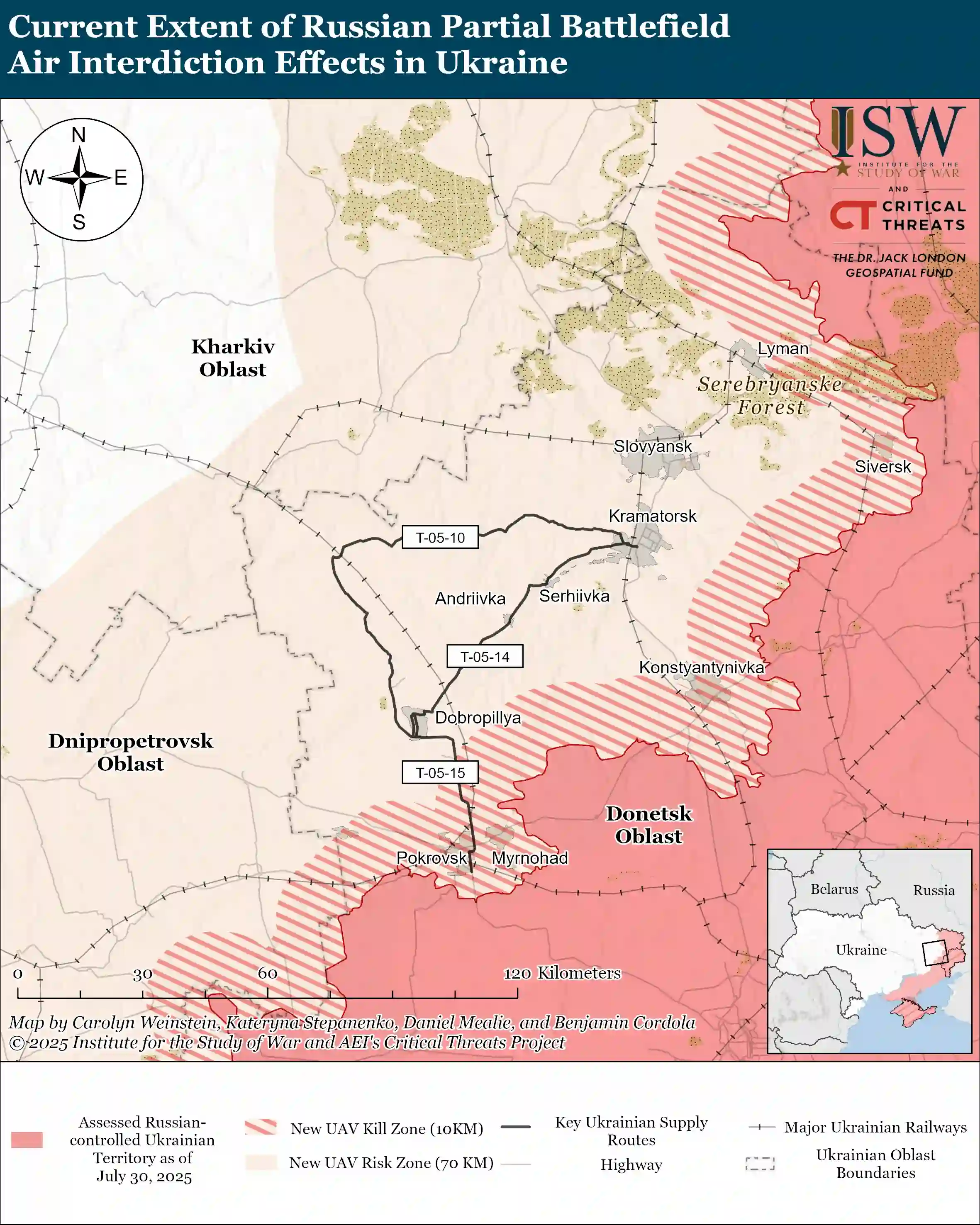 据报告,俄罗斯部队正通过战术无人机剥夺乌克兰军队使用位于近纵深区域关键高速公路与地面交通线的能力,此举加剧了乌军在波克罗夫斯克方向与东部要塞地带的防御作战困难。乌克兰政府自七月十六日起临时禁止平民使用多布罗皮利亚-利曼T0514高速公路位于克拉马托尔斯克、谢尔希伊夫卡、安德烈伊夫卡与多布罗皮利亚之间的路段,原因系俄罗斯第一人称视角无人机构成的威胁升级[8]。T0514高速公路是一条重要地面交通线,其走向与当前战线平行并延伸至顿涅茨克州的乌克兰要塞地带,连接乌军在克拉马托尔斯克的主要后勤枢纽,并贯通多布罗皮利亚附近波克罗夫斯克方向乌军残余地面交通线。该公路距活跃战线二十五至五十四公里,表明俄军战术无人机能力显著提升,可威胁较以往更纵深区域的乌军地面交通线。乌克兰顿涅茨克州行政长官瓦迪姆·菲拉什金报告称,俄军无人机“完全控制”T0514及其他未指明高速公路,可能暗示俄军已对该公路建立火力控制(即在未物理占领情况下剥夺乌军使用道路的能力)[9]。菲拉什金表示乌军正沿T0514等高速公路部署反无人机网,以防御现代化俄制第一人称视角无人机、“兰开斯特”巡飞弹药及其他未指明无人机[10]。他特别指出,乌当局向康斯坦丁诺夫卡、波克罗夫斯克与米尔诺格勒运送人道主义与医疗援助面临困难,因俄军使用第一人称视角无人机(尤其是光纤无人机)对通往这些城市的全部道路维持火力控制[11]。俄方消息源亦在2025年7月中旬传播显示高速公路遭摧毁卡车的影像,声称该画面证明俄军正以战术无人机遮断T0514公路[12]。