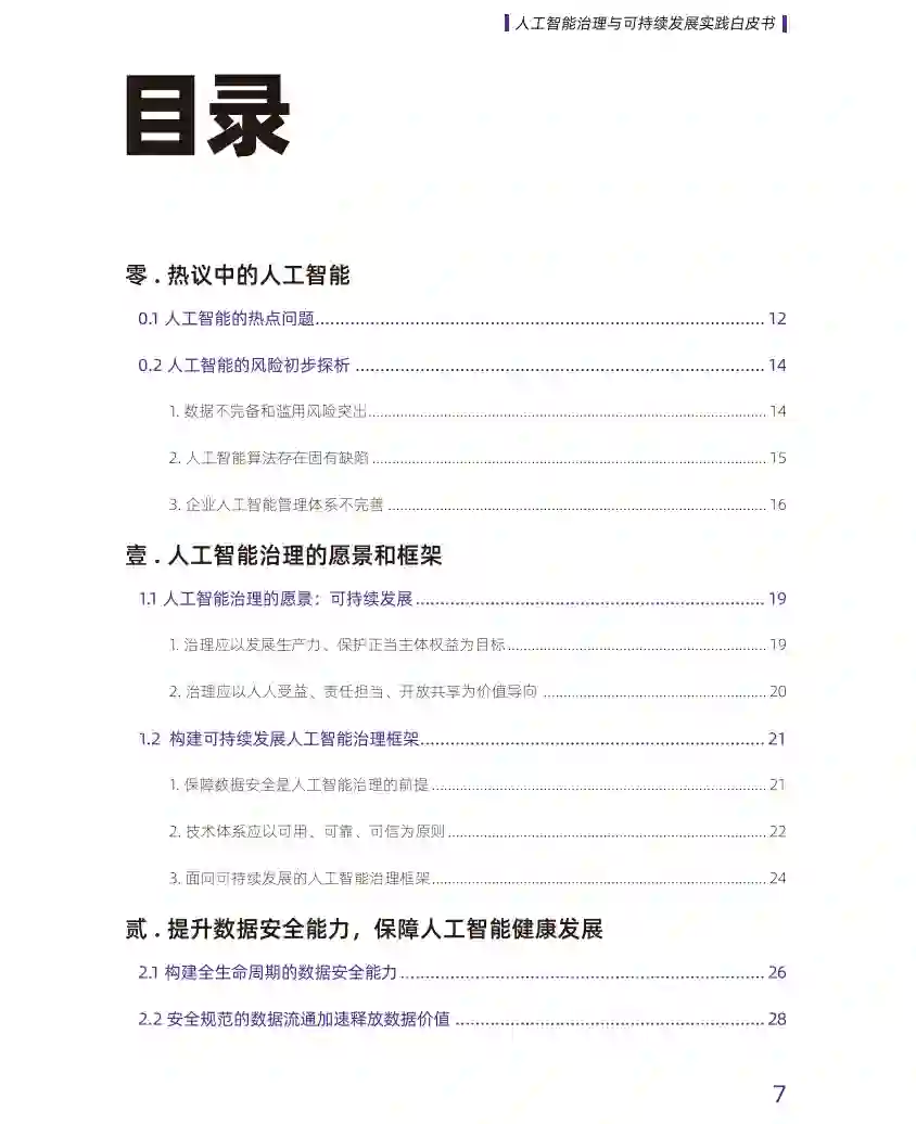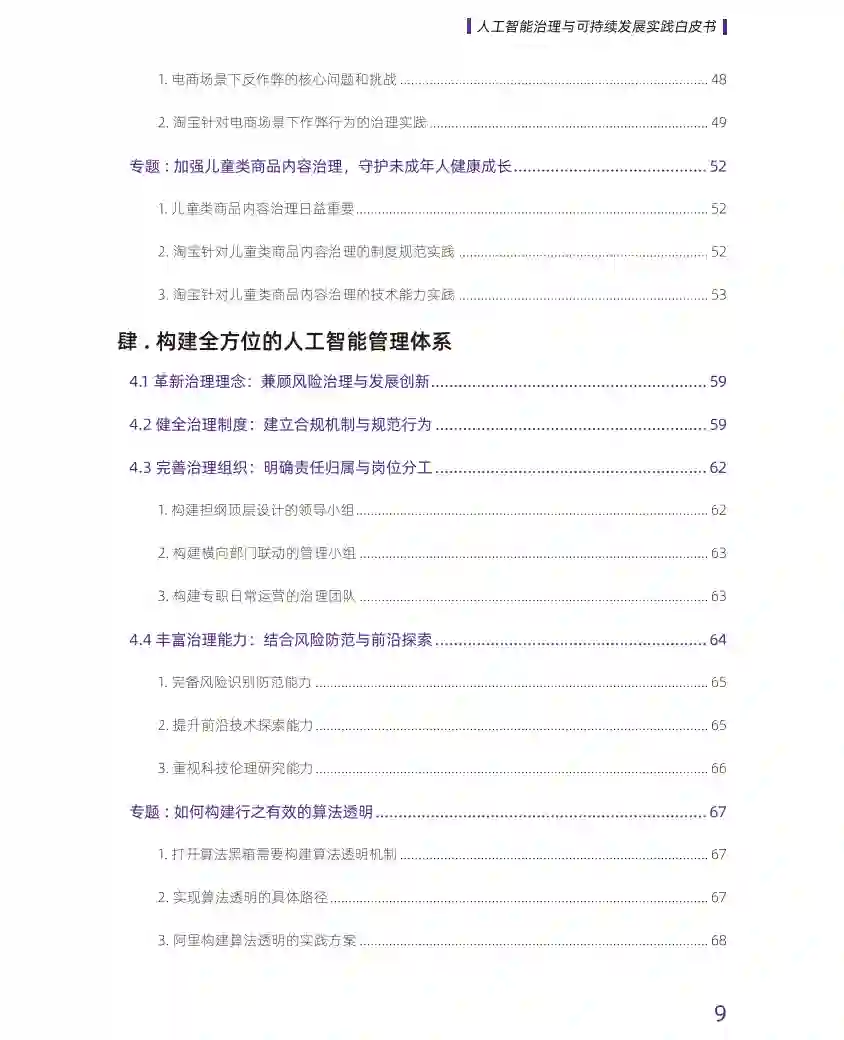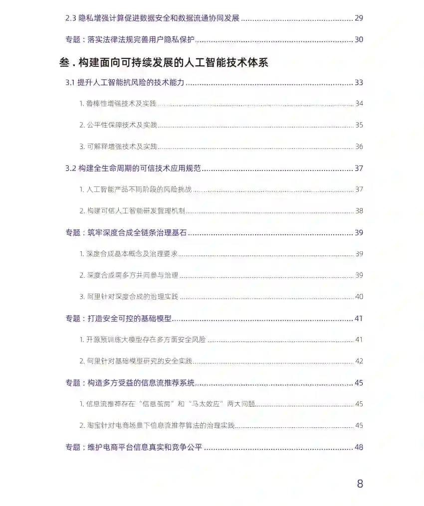 本白皮书全面总结了阿里巴巴在人工智能治理与可持续发展领域的实践,重点针对当前人工智能应用中的热点问题,从数据、技术、管理及多元协同等方面系统性介 绍了我们的实践思路和方法,同时辅以若干专题进行阐释,期待为社会各界提供有益参考。