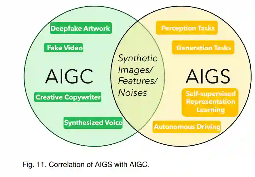 伴随着ChatGPT和Stable Diffusion的出现,AIGC的研究主题变得前所未有地受欢迎。AIGS与AIGC有强烈的相关性,因为它们都使用深度学习技术来生成新颖的内容。它们共同拥有的合成产品包括合成图像、合成特征[83]和合成噪声[203]等。 尽管如此,AIGS的设计目的是使用这些合成产品作为下游应用的数据源,重点是计算机视觉任务,而AIGC旨在生产更广泛的创意作品,包括但不限于视觉内容、文本内容、音频内容等。他们之间的相关性可以从图11中详细查看。