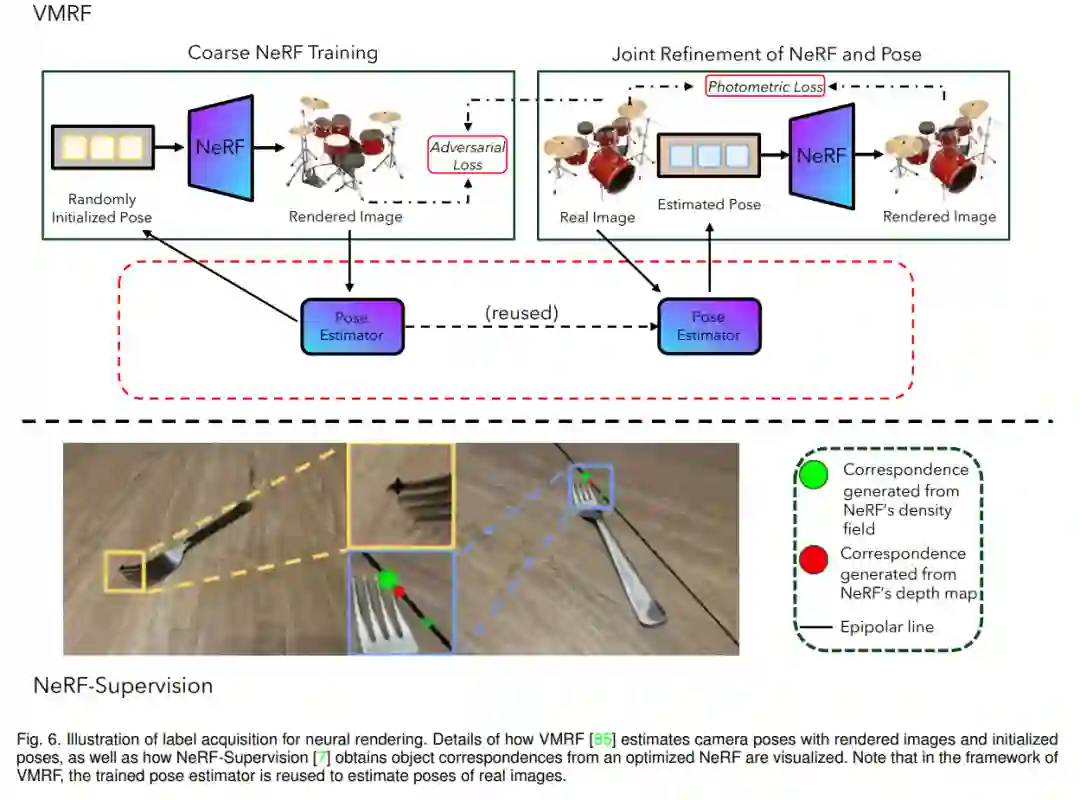 广义上讲,生成模型包括生成对抗网络 (GANs) [21]、变分自编码器 (VAEs) [51]、自回归模型 [52], [53]、流模型 [54], [55]、以及扩散模型 (DMs) [22]。特别地,由于它们在视觉生成中的广泛应用,GANs 和 DMs 在AIGS中显著地成为了最常用的基础模型。在以下章节中,我们首先回顾GANs 和 DMs的基本原理 (第2.1.1节)。之后,我们展示在训练数据合成过程中 GANs 和 DMs 是如何工作的 (第2.1.2节)。 **神经渲染 **
