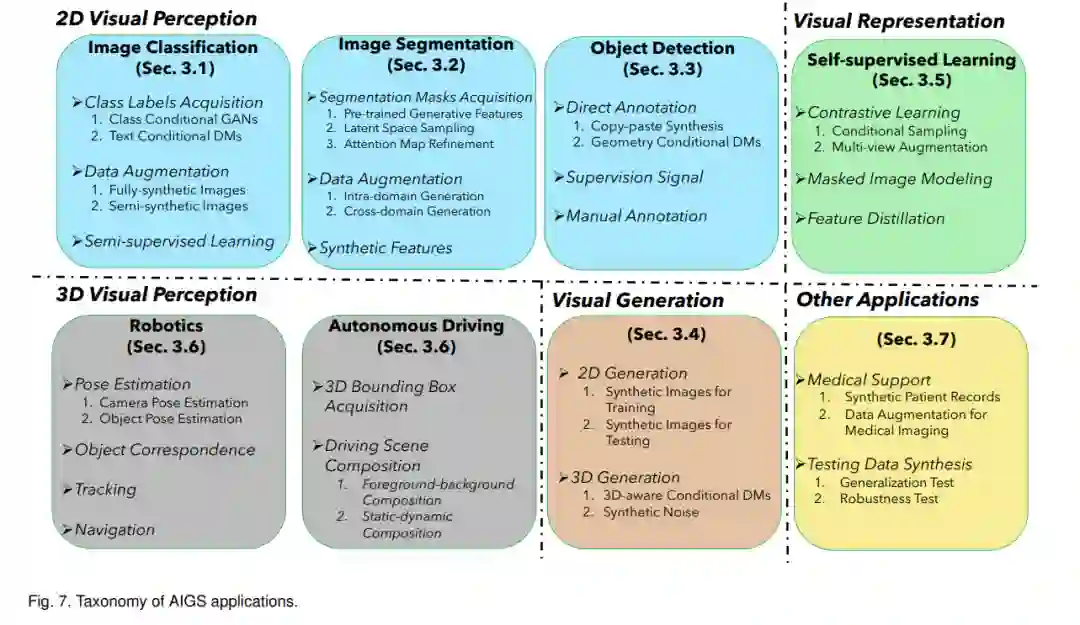 作为一个相对新的机器学习范式,AIGS已经赋予计算机视觉中的各种下游任务新的能力。在本节中,我们将深入研究与AIGS相关的那些应用。尤其是,我们将关注以下五个子类:(1) 2D视觉感知任务,包括图像分类(第3.1节)、图像分割(第3.2节)和物体检测(第3.3节),其中这三个任务迄今为止占据了AIGS应用的绝大部分;(2) 视觉生成任务(第3.4节),我们探讨在训练生成模型而非判别模型时如何使用合成图像;(3) 自我监督学习任务(第3.5节),我们关注合成图像如何使视觉表示学习者变得更强大;(4) 3D视觉感知任务,包括在机器人技术(第3.6节)和自动驾驶(第3.7节)领域的应用,我们将检查在建模复杂的3D场景时合成图像如何传递3D感知信息;(5) 其他应用(第3.8节),我们将研究如何在一些特定的场景中,如医学和测试数据合成,应用AIGS范式。详细的分类呈现在图7中。