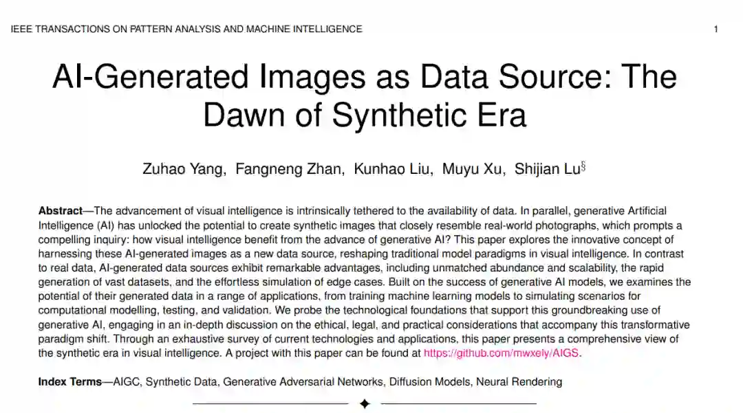 随着数据的可用性,视觉智能的发展与之密切相关。与此同时,生成式人工智能(AI)已经解锁了创建与真实世界照片极为相似的合成图像的潜力,这引发了一个引人注目的问题:视觉智能如何从生成式AI的进步中受益?本文探讨了利用这些AI生成的图像作为新的数据来源这一创新概念,重新塑造了视觉智能中的传统模型范式。与真实数据相比,AI生成的数据来源展现出了卓越的优势,包括无与伦比的丰富性和可扩展性、快速生成大量数据集、以及轻松模拟边缘情况。基于生成式AI模型的成功,我们研究了其生成数据在各种应用中的潜力,从训练机器学习模型到为计算建模、测试和验证模拟场景。我们探讨了支持这一生成式AI突破性应用的技术基础,并深入讨论了伴随这一转型范式转变的伦理、法律和实践考虑因素。通过对当前技术和应用的详尽调查,本文为视觉智能中的合成时代提供了一个全面的视角。本文的相关项目可以在https://github.com/mwxely/AIGS 找到。