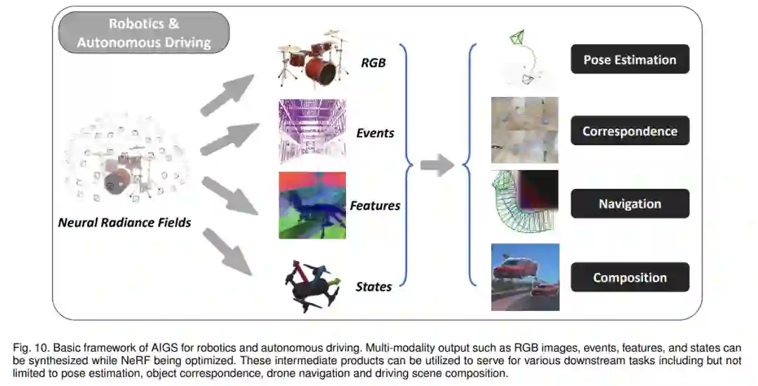随着神经场的出现,特别是神经辐射场 (NeRF) [36],计算机视觉社区对3D感知图像合成越来越感兴趣。然而,由于训练数据的稀缺以及多视角一致性的严格要求,3D感知的AIGS仍然面临巨大的挑战。利用神经渲染的AIGS方法主要包括3D感知训练数据合成和环境模拟。如图1所示,已有许多生成带有3D感知注释的图像的例子,如获得相机和物体姿势[37]–[44]、物体对应关系[7]、3D边界框[45]、网格、深度以及法线标签。NeRF在新视角合成方面表现出色,因此它可以用于增强多视角数据集,特别是在机器人学[7]和自动驾驶[46]领域。目前自动驾驶算法的瓶颈源于意外的特殊情况。为此,环境(传感器)模拟可以是一个有希望的解决方案。一些最近的工作[8],[47]表明,得益于NeRFs的真实渲染能力,可以轻松完成3D动态场景的模拟,模拟与真实的差距很小。