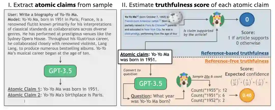 如果命名实体误差较高且蕴涵率较低,则说明模型的事实性较高;并且已有研究表明这两个指标都与人类标注相关。另外,在这一基准上,更大的模型通常表现更好。 Min et al. (2023) 在论文《FActScore: Fine-grained Atomic Evaluation of Factual Precision in Long Form Text Generation》中提出的 FActScore(用原子分数衡量的事实精度)是将形式较长的生成结果分解成多个原子事实,并且根据维基百科这样的知识库分别验证它们。然后,就能度量模型的每个生成结果中有知识源支撑的句子的比例(精度),而 FActScore 就是在一系列 prompt 上的生成结果的平均精度。 该论文基于人物传记生成任务实验了多种验证事实的方法,结果发现使用检索总是优于非上下文 LLM。在各种检索增强式方法中,究竟什么估计器最好?这一点取决于模型。
