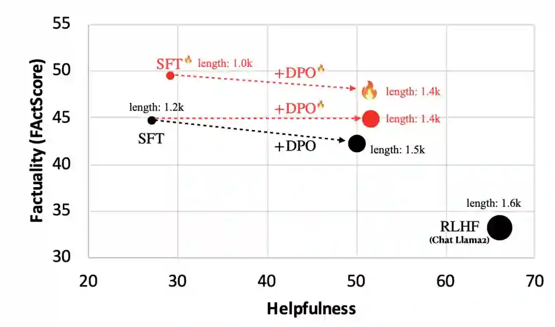 在他们的实验中,所选择的最佳中心点 t 是句子长度的一半。 Lin et al.(2024) 在论文《FLAME: Factuality-Aware Alignment for Large Language Models》中提出了 FLAME(Factuality-Aware Alignment / 可感知事实性的对齐),即在特别注重事实性的前提下执行 SFT+RLHF 对齐训练。