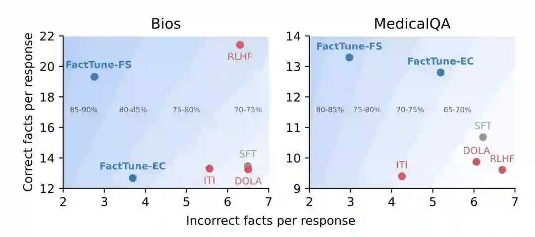 图 21:在传记生成任务上,在使用和不使用可感知事实性的设置下,SFT 和 DPO 运行的性能。有用性(Helpfulness)是在 Alpaca Eval 基准上测量的模型对于基础 SFT + DPO 方法的胜率。请注意,RLHF 会让事实性变差,因为人类反馈往往偏好更长更详细的答案,但这种答案并不一定更符合事实。 Tian & Mitchell et al. (2024) 在论文《Fine-tuning Language Models for Factuality》中提出了事实性微调(Factuality tuning),其也是通过微调语言模型来提升其事实性。他们实验了不同的方法来估计每个模型样本中的原子陈述的真实度,然后再运行 DPO。
