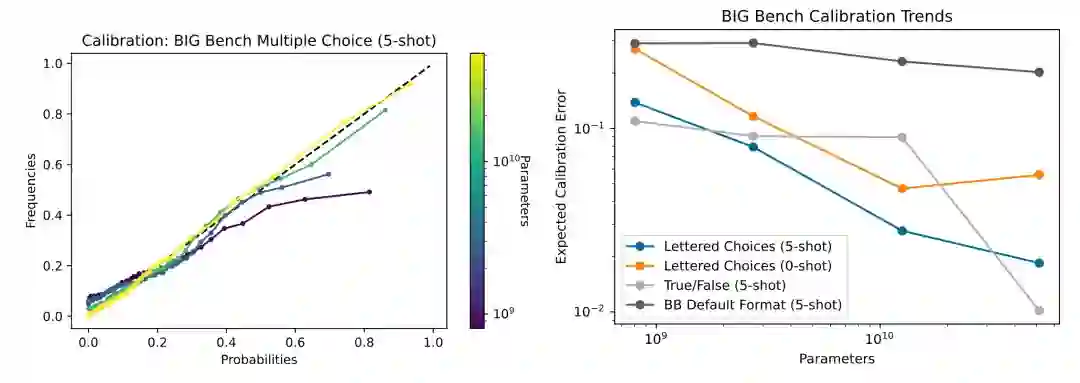 图 9:(左)不同大小模型的校准曲线:更大的模型的校准表现更好。(右)对于校准误差来说,问题的格式很重要。 Lin et al.(2022) 使用了 CalibratedMath 任务套件。CalibratedMath 是一个以可编程方式生成的数学问题套件,其可生成不同难度的数学问题(取决于数的数量),可用于检测模型的输出概率的校准程度。对于每个问题,模型必须给出一个数值答案以及对该答案的置信度。这里考虑了三种概率: