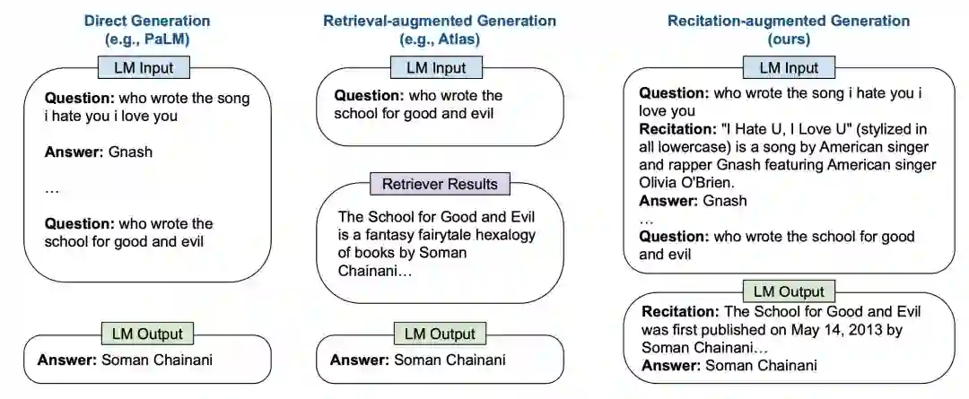 Sun et al. (2023) 在论文《Recitation-Augmented Language Models》中提出的** RECITE **将复述(recitation)作为了一个中间步骤,以此提升模型生成结果的事实正确度并减少幻觉。其设计思路是将 Transformer 记忆用作信息检索模型。在 RECITE 的「复述再回答」方案中,LLM 首先需要复述相关信息,然后再生成输出。 确切来说,可以使用少样本上下文提词技术来教模型生成复述,然后基于复述内容生成答案。不仅如此,它还能与使用多个样本的自我一致性集成方案组合使用,并且还能扩展用于支持多次跳转的问答。 图 17:比较直接生成方法、RAG 和 RECITE 生成的复述能与基于 BM25 的检索模型相媲美,但这两者都不及使用包含真实事实的文本段。根据他们的误差分析,大约 7-10% 的问题虽复述正确但未能得到正确答案,而大约 12% 的问题虽复述错误但却回答正确了。 采样方法