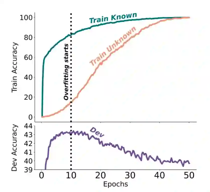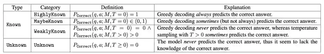 为了提升模型的某些具体能力(比如指令遵从),一种常用方法是通过监督式微调和 RLHF 等技术对预训练 LLM 进行微调。在微调阶段,难免需要引入新知识。 微调所需的计算量通常少得多,因此小规模微调究竟能否可靠地让模型学到新知识也备受争议。Gekhman et al. 的论文《Does Fine-Tuning LLMs on New Knowledge Encourage Hallucinations?》研究了这一问题:用新知识微调 LLM 是否会助长其幻觉?他们发现:(1) 当微调样本中包含新知识时,LLM 学习的速度会更慢一些(相比于微调样本中的知识与模型已有知识一致的情况);(2) 模型一旦学习了带有新知识的样本,那么模型会更倾向于产生幻觉。 给定一个闭卷问答数据集(EntityQuestions),D=(q,a), 我们可以将模型 M 准确生成问题 q 的正确答案 a 的概率定义为 P_Correct (q,a;M,T),其中 T 为解码温度值,并且提示工程方法是使用随机少样本示例。 他们基于 P_Correct (q,a;M,T) 的不同条件将示例样本简单分成了四类:HighlyKnown、MaybeKnown、WeaklyKnown(这三个是不同程度的已知类)和 Unknown(未知类)。 图 1:基于模型输出正确答案的可能性对闭卷问答示例样本进行知识方面的分类。 这些实验得到了一些有趣的观察,其中可以认为开发集(dev set)准确度能指示幻觉程度: