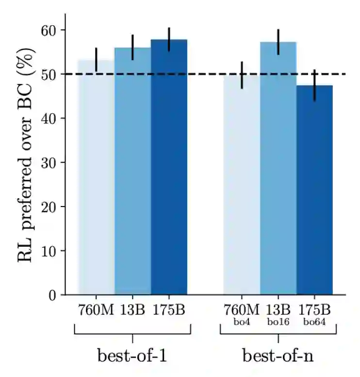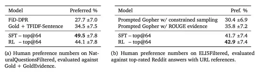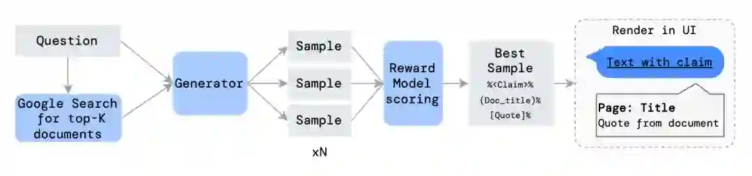 在减少幻觉方面,一种好方法是在为搜索结果生成条件时为模型输出分配归因。训练 LLM 更好地理解检索到的内容和分配高质量归因是一个比较热门的研究分支。 Nakano, et al. (2022) 在论文《WebGPT: Browser-assisted question-answering with human feedback》中提出的 WebGPT 将用于检索文档的网络搜索与微调 GPT 模型组合到了一起,目的是解答长篇问题以降低幻觉,实现更好的事实准确度。 该模型可通过一个基于文本的网络浏览器与互联网搜索交互,并学习使用参考网页给出答案。在模型进行浏览时,它能采取的一个动作是引用当前页面的摘录。在执行这个动作时,页面标题、域名和摘录会被记录下来,以备之后用作参考。WebGPT 的核心是使用参考来辅助人类评价事实正确性。 首先,使用网络浏览环境来回答问题以便行为克隆,在人类演示上对模型进行监督式微调。收集模型对同一问题生成的两个答案(每个答案都有自己的一组参考),得到比较数据,其中根据事实准确度、连贯性和整体有用性评价答案。使用奖励模型来进行强化学习训练和 best-of-n(n 中选最佳)拒绝采样。相较之下,强化学习带来的好处很小,使用拒绝采样带来的好处就更少了。 图 24:相较于行为克隆(BC)方法,强化学习训练只能带来少量提升,尤其是当使用了 best-of-n 拒绝采样时。 Menick et al. (2022) 在论文《Teaching language models to support answers with verified quotes》中提出的 GopherCite 与 WebGPT 非常类似,都使用了搜索引擎来创建支持材料以及教模型提供参考。 这两种方法都使用了监督式微调来进行引导,并且都使用了根据人类偏好的强化学习。但不同之处在于,WebGPT 依赖于人类演示来进行行为克隆,而 GopherCite 则是通过少样本提词来生成演示,并且每一次生成都会使用相关文档来填充上下文,然后使用奖励模型来评估哪个最好。