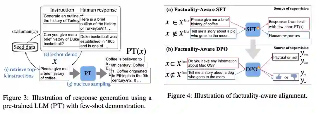 (1) 将 RAG 数据样本用作正例,将原始的模型生成结果用作负例作为奖励模型数据。(2) 将 FActScore 用作事实性的奖励信号。 图 20:左图:对一个预训练 LLM 使用少样本提词而生成的响应;右图:可感知事实性的对齐训练流程 为了避免在对齐训练时意外将未知知识蒸馏到模型中,他们建议使用模型生成的响应来构建 SFT / DPO 数据集。