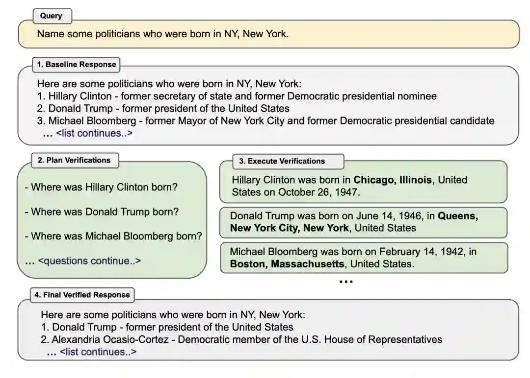 我们也可以不使用外部检索到的知识,而是设计一个流程让模型可以自己执行验证和修订,从而减少幻觉。 Dhuliawala et al.(2023) 在论文《Chain-of-Verification Reduces Hallucination in Large Language Models》中提出了一种名为** Chain-of-Verification (CoVe / 验证链)的方法**。该方法是基于动作链来规划和执行验证。CoVe 包含四个核心步骤: