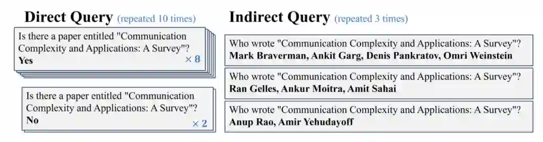 Agrawal et al.(2023) 在论文《Do Language Models Know When They're Hallucinating References?》中研究了 LLM 生成结果中出现幻觉参考文献的问题,比如编造出不存在的书籍、文章和论文标题。 他们实验了两种根据一致性来检查幻觉的方法:直接查询和间接查询。这两种方法都在 T > 0 时多次运行检查并验证一致性。 图 11:用于检查参考文献幻觉的直接查询和间接查询。 直接查询是让模型判断生成的参考文献是否存在。间接查询则是要求提供生成的参考文献的辅助信息,比如作者是谁。 举个例子,如果我们想检验「以下论文是不是真的?」我们可以检查「这篇论文的作者是谁?」这里的假设是:如果生成的参考文献是幻觉结果,那么相比于直接询问该参考文献是否存在并得到肯定响应的可能性,多次生成结果都有同样作者的可能性会更低。 实验结果表明间接查询方法的效果更好,并且更大的模型能力更强,幻觉也更少。 反幻觉方法