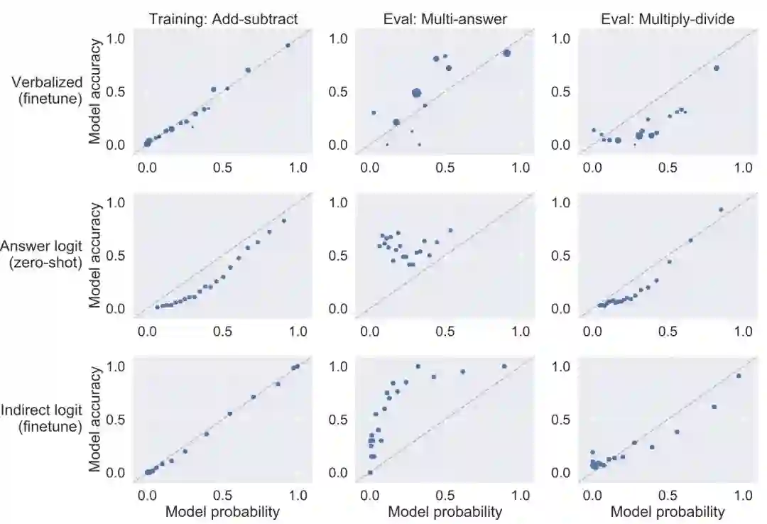 图 10:训练和评估的校准曲线。该模型在「加法 - 减法」任务上进行了微调,在多答案(每个问题都有多个正确答案)和「乘法 - 除法」任务上进行了评估。 间接查询