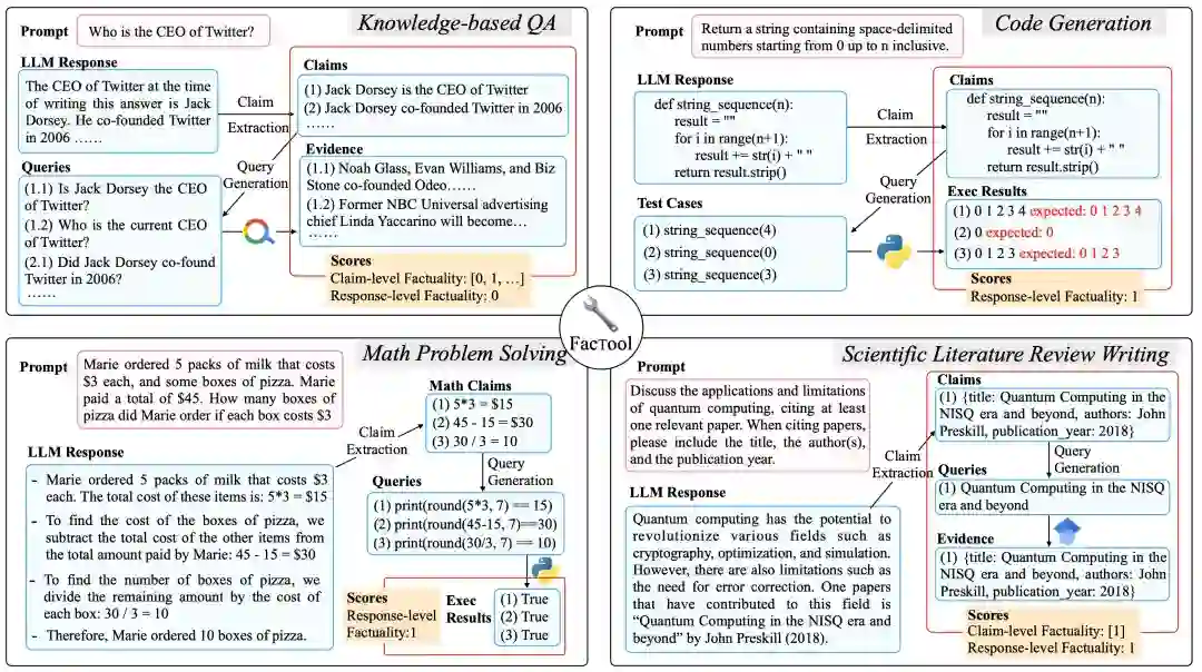 图 6:用于评估事实性的 FacTool 框架,适用于多种任务设置:基于知识的问答、代码生成、数学问题求解、科学文献总结。 基于采样的检测