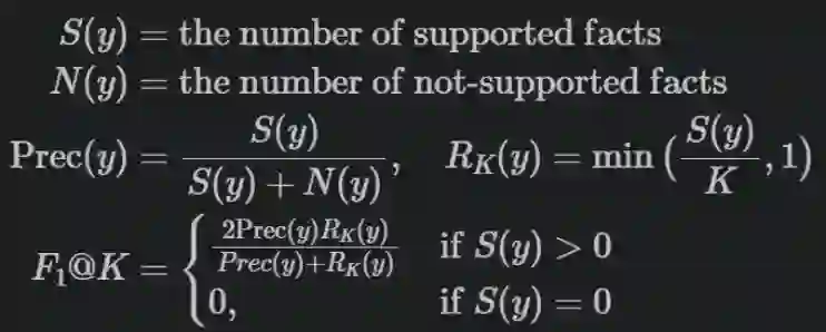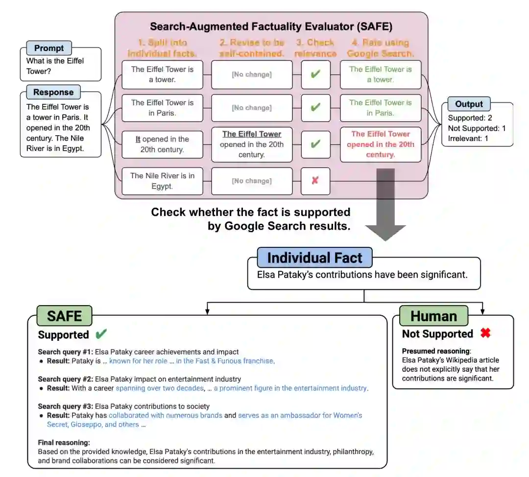 Wei et al. (2024) 的论文《Long-form factuality in large language models》提出了一种用于检验 LLM 的长篇事实性的评估方法:Search-Augmented Factuality Evaluator(SAFE),即搜索增强式事实性评估器。也可参阅机器之心的报道:《DeepMind 终结大模型幻觉?标注事实比人类靠谱、还便宜 20 倍,全开源》。 相比于 FActScore,SAFE 的主要不同之处是:对于每一个独立的原子事实,SAFE 会使用一个语言模型作为智能体,其作用是通过一个多步过程迭代式地向谷歌搜索发送查询并对搜索结果执行推理,看这些结果是否支持该事实。在每一步,该智能体会根据给定的待检验事实以及之前的搜索结果生成一个搜索查询。执行一些步骤之后,该模型再执行推理,以判断事实能否得到搜索结果的支持。 从实验结果看,SAFE 方法的表现优于人类标注者,同时成本还低 20 倍:与人类的一致率为 72%,而当与人类不一致时,SAFE 胜过人类的胜率为 76%。 图 4:用于长篇 LLM 生成的事实性评估的 SAFE 方法概况 SAFE 评估指标是 F1 @ K,其设计思路基于这一思考:模型对于长篇事实性的响应应当在精度和召回率上都达到理想水平,因为该响应应当同时满足事实性和长篇这两个条件。