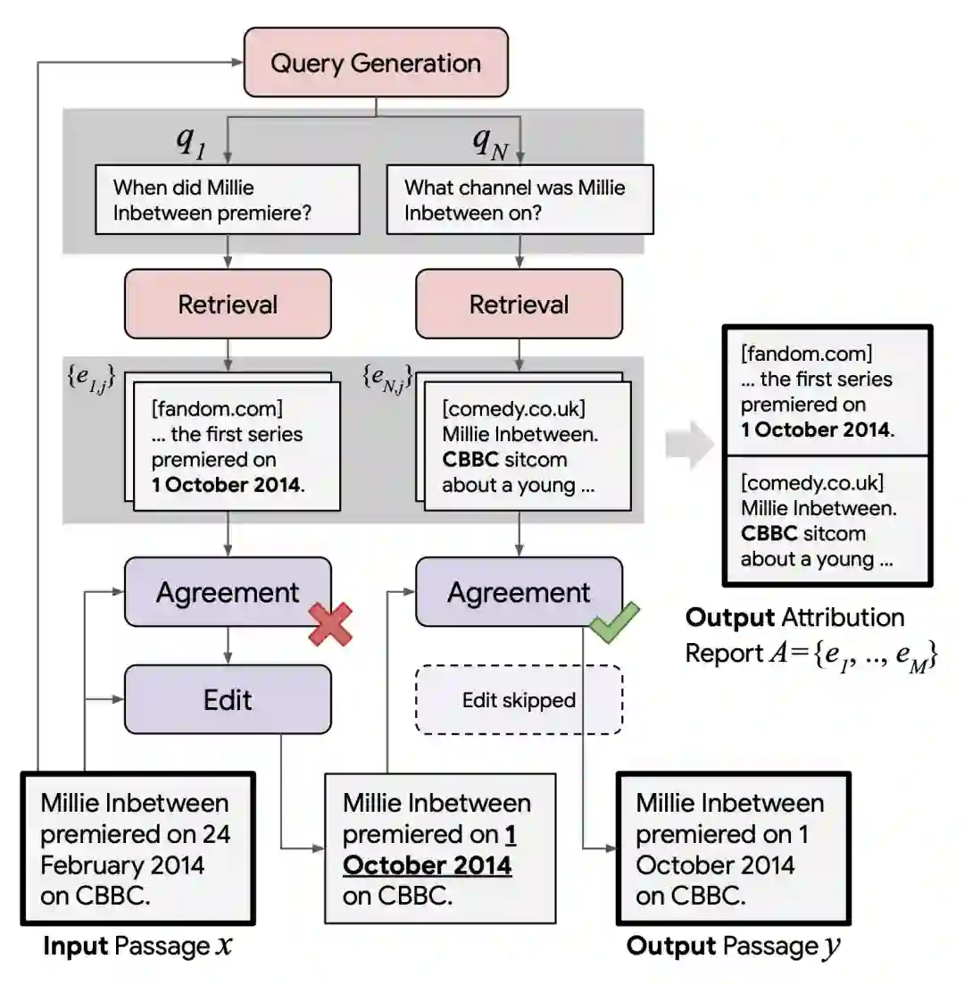 RAG 是指「检索增强式生成」,这是一种非常常用的用于提供真实基础信息的方法。简单来说,RAG 就是先检索相关文档,然后将其用作额外上下文来执行生成。 RARR 则来自 Gao et al. (2022) 的论文《RARR: Researching and Revising What Language Models Say, Using Language Models》,是指「使用研究和修订来改进归因」。该框架是通过归因编辑(Editing for Attribution)来追溯性地让 LLM 有能力将生成结果归因到外部证据。给定模型生成的文本 x,RARR 会进行两步处理,之后输出修订后的文本 y 和一份归因报告 A: