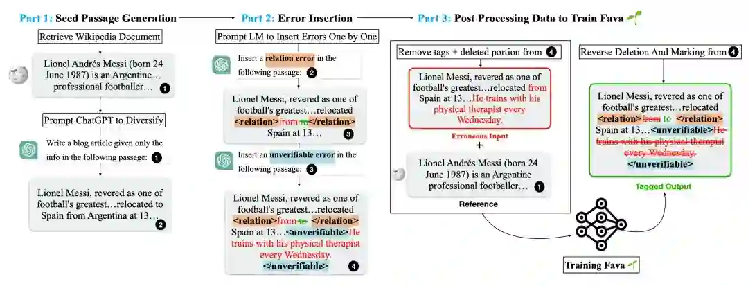 类似于使用「搜索 + 编辑」的 RARR,Mishra et al. (2024) 在论文《Fine-grained Hallucination Detection and Editing for Language Models》中提出的 **FAVA(使用增强知识进行事实性验证)**还能检索相关文档,然后编辑模型输出以避免幻觉错误。FAVA 模型由一个检索器 ℳ_ret 和一个编辑器 ℳ_edit 构成。