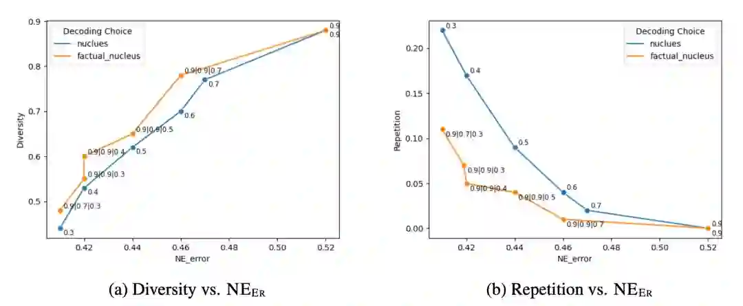 Lee, et al.(2022) 在论文《Factuality Enhanced Language Models for Open-Ended Text Generation》中发现核采样(nucleus sampling,top-p 采样)在 FactualityPrompt 基准上的表现不及贪婪采样,但它的多样性更优且重复更少,因为核采样会添加额外的随机性。因此他们提出了事实性 - 核采样算法。 该算法基于这一假设:相比于在句子开头处,采样随机性对句子后段的事实性的危害更大。事实核采样是在采样每个句子的 token 期间动态地调整概率 p。 对于一个句子中的第 t 个 token,有 p_t = max (ω,p・λ^{t-1}),其中 ω 是为了防止采样落回成贪婪采样,这有损生成质量和多样性。 图 18:相比于标准的核采样,事实核采样能让多样性更好同时减少重复,而幻觉误差是以命名实体(NE)误差度量的。 Li et al. (2023) 在论文《Inference-Time Intervention: Eliciting Truthful Answers from a Language Model》中提出了推理时间干预(ITI)。其中通过在每一层的激活上拟合线性探针来区分真实输出和虚假输出,研究了某些注意力头是否与事实性更相关。 他们发现,对许多注意力头来说,探针并不能做到比随机更好,但也有一些表现出了很强的性能。ITI 会首先找到一组在真实度方面具有高线性探测准确度的注意力头,然后沿「真实」方向移动前 K 个所选注意力头的激活。