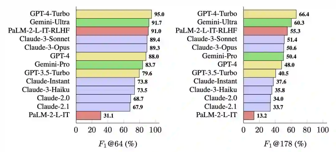 图 5:F1 @ K 度量的一些主流模型的长篇事实性性能,评估过程使用了来自 LongFact 基准 LongFact-Objects 任务的 250 个随机 prompt。 Chern et al. (2023) 在论文《FacTool: Factuality Detection in Generative AI — A Tool Augmented Framework for Multi-Task and Multi-Domain Scenarios》中提出的 FacTool 采用了一种标准的事实检验流程。其设计目标是在多种任务上检测事实性错误,包括基于知识的问答、代码生成、数学问题求解(生成测试用例而不是陈述)、科学文献总结。该流程为: