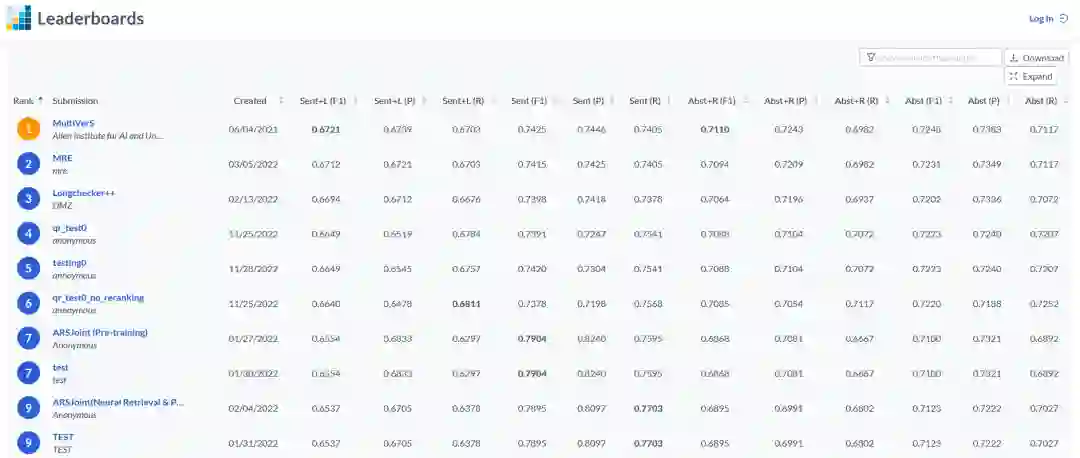 scifact同样作为一个开放的数据集任务寻求着各个研究团队的加入,目前该数据集上得分最高的模型是scifact数据集作者之后创作的Multivers模型,该模型致力于利用上下文的信息整合抽取到的多个证据并作出最终的判断,它基于主张和全文档上下文的共享编码以多任务方式预测事实检查标签并识别理由。这种方法实现了两个关键的建模目标。首先,它确保所有相关的上下文信息都被考虑到每次决策中。其次,它使模型能够从注释了文档级事实检查标签,但缺乏句子级理由的实例中学习。如前文所言,大模型的幻觉的成因很可能与证据融合错误有关,因此这一事实验证方法相信会对大模型的检测起到一定的帮助作用。
