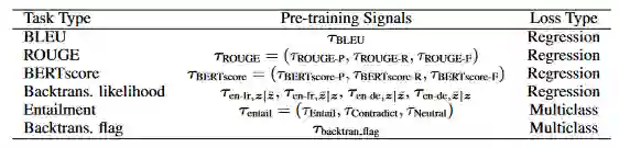 (1) 参考句子的集合应该大而且多样化,这样BLEURT就能应对各种NLG领域和任务。(2) 句子对应该包含各种词汇、句法和语义的不同。这里的目标是预见NLG系统可能产生的所有变化,例如,短语替换、释义、噪声或省略。(3) 预训练目标应该有效地捕捉这些现象,这样BLEURT就能学会识别它们。以下章节将介绍我们的方法。 表2 各种评分方法与其损失函数