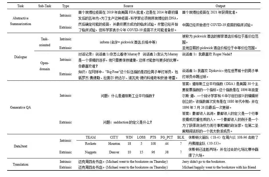 作为一个具有挑战性但尚未被深入探索的任务,GQA任务中还没有关于幻觉的标准定义。然而,几乎所有关于GQA的研究[7, 8]都涉及一个人类评价过程,在这个过程中,衡量生成答案的忠实程度的事实正确性可以被视为对幻觉的一种测量;即,答案越忠实,它包含的幻觉内容就越少。最近的一项研究[9]使用了语义漂移这个术语,它指的是答案在生成过程中离正确答案漂移的程度,这也可以被视为GQA中幻觉的一个特定定义。 香港科技大学的CAiRE实验室对不同task中的幻觉进行了总结,在表1中给出了GQA任务中两个具体的幻觉例子。两个问题的来源都是维基百科网页。对于第一个问题,“道琼斯工业平均指数是什么?”,生成的答案“美国30个主要股票指数的指数”与维基百科中的声明“美国上市的30家知名公司的指数”产生了冲突,在这个例子中,模型产生的回答对一个概念的回答产生了幻觉,对于模型用户而言,这个小小的错误由于模型的回答与答案很接近并且回答的有理有据,很有可能一直让用户对这个概念产生误解,如果这是一个上市公司产生的搜索,那么这个错误带来的经济负面影响不可估量。