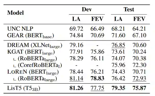 这一转化问题的方法与之前prompt的思路不谋而合,同样其本质还是对声明进行token级别的验证,相当于把原本的比较token之间的相似度通过一个阅读理解模型的转化进行一个中间形态的比较,这一方法的效果如表5所示,其正确率与LisT5相当,而LisT5是一个3B的模型,其体量远超LoRen,而LOREN在开发集中在FEV分数上超过了LisT5。对于DREAM,我们注意到它在测试集的LA分数上比LOREN更高。由于证据检索策略和主干预训练语言模型的差异,LOREN与DREAM并不完全可比。然而,LOREN(BERT和RoBERTa)更高的FEV分数表明,与DREAM相比,它的决策更忠实于证据。相反,我们与KGAT(其相同的PLMs和证据检索技术)进行了更公平的比较,发现LOREN配备的BERTlarge和RoBERTalarge分别超过了KGAT的RoBERTalarge和CorefRoBERTalarge。