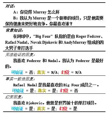 如图1所示,在[5]中北卡罗纳大学和Alexa AI的研究中发现,大模型在多轮对话中会产生图1所示的三种幻觉类型:**无法进行验证的虚拟事实回应,与输入知识不相符的事实不一致回应,以及对于输入中不存在的问题的虚构回应。**这种标签与以前的工作不同,因为在处理开放领域对话中,不是所有回应都需要评估事实正确性,其中创意生成等需要模型创作新文本的任务经常不存在事实是否正确,因此该团队设置了如图1的实验,来验证模型是否会生成幻觉,在图中的例子可以看出,模型把两个不同人的经历和属性混淆了,这也反映了前面对幻觉产生原因的印证,即模型幻觉的产生往往是因为证据过多,无法有效融合。
