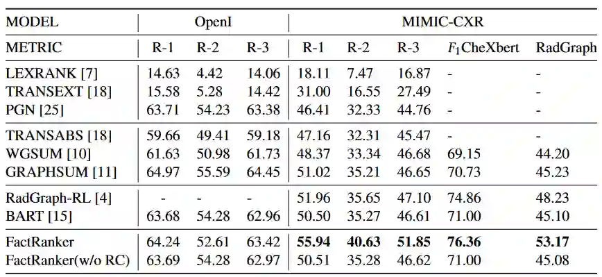 然而,这些模型的理论最优性能和他们的实际输出之间存在着显著的差距,这是因为在解码过程中没有事实引导。这些方法中的绝大多数采用了诸如贪婪搜索、波束搜索和多样性波束搜索等解码策略,这些策略并未将事实一致性作为从𝑘个生成的摘要中选择最佳摘要的标准。这些解码方法通常维持一个最好的𝑘个候选者列表,并根据对数概率进行排序来输出最好的一个。然而,剩下的𝑘 − 1个候选者可能包含更多的正确事实。因此,Xie团队在文章中提出了图3中的基于知识三元组的匹配方法,该方法训练模型比较放射报告与影像学结果之间的异同,通过抽象出其中药物的三元组关系并计算二者的余弦相似度,以比较两个不同报告之间的描述是否存在差异,帮助医生进行总结与发现问题。这一方法的效果如表3所示,factranker的F1值远远超过其他方法,同时利用CheXbert作为评价模型时,也超过了其文章中的SOTA。