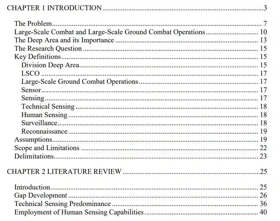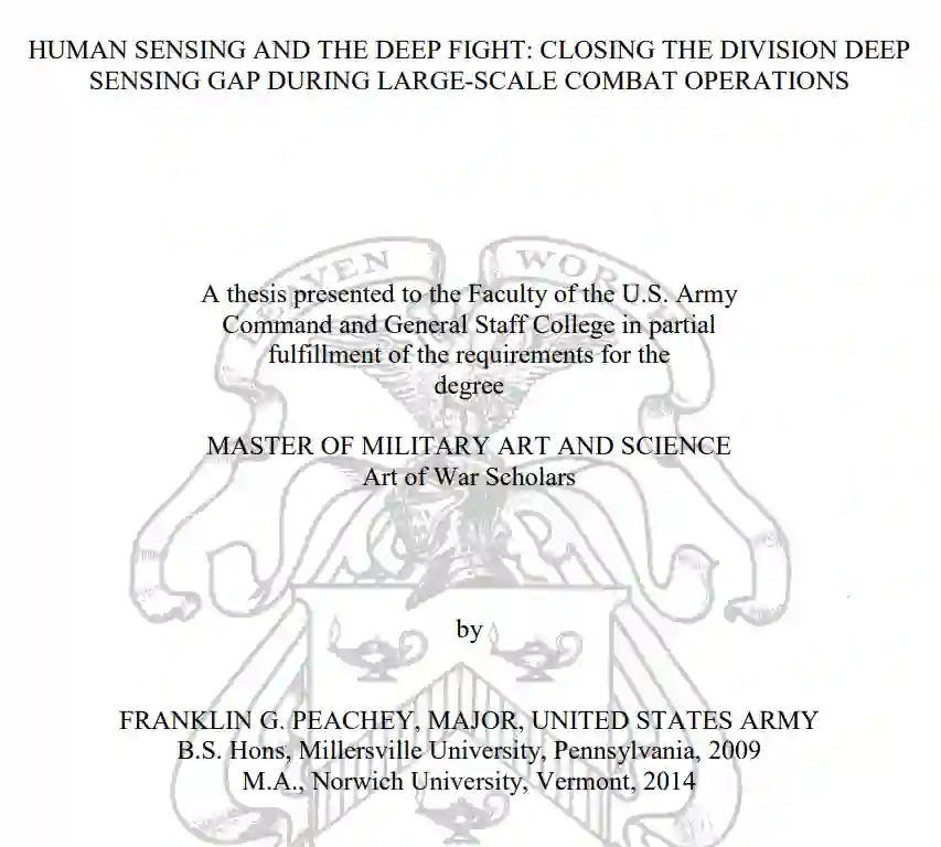 在专注于反叛乱行动近 20 年后,美国陆军正重新将重点放在大规模作战行动上。在重新夺回陆域主导权的过程中,陆军已将纵深感知确定为当前的能力缺口。本研究的重点是一个师有效塑造其纵深区域所需的战术纵深感知。自 21 世纪初陆军转型为以旅为中心的部队以来,师在纵深区域内的感知能力出现了差距。造成这种差距的原因是,技术和人力感知能力被剥离并调整到了师之外。然而,一个师要想有效地为其旅级战斗队塑造战斗,就必须能够在其纵深区域内进行感知。本文将探讨人类感知能力如何有助于缩小师纵深感知差距。
