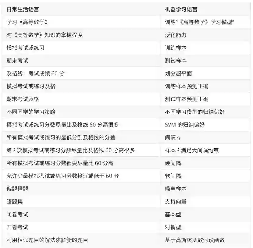 下表对 SVM 中涉及的一些概念用学习《高等数学》课程的例子进行类比,类比不见得严谨,但是有助于理解概念。我们学习机器学习还有一个意义是促进人类的学习,SVM 中的很多思想和策略对人类学习很有启发价值。