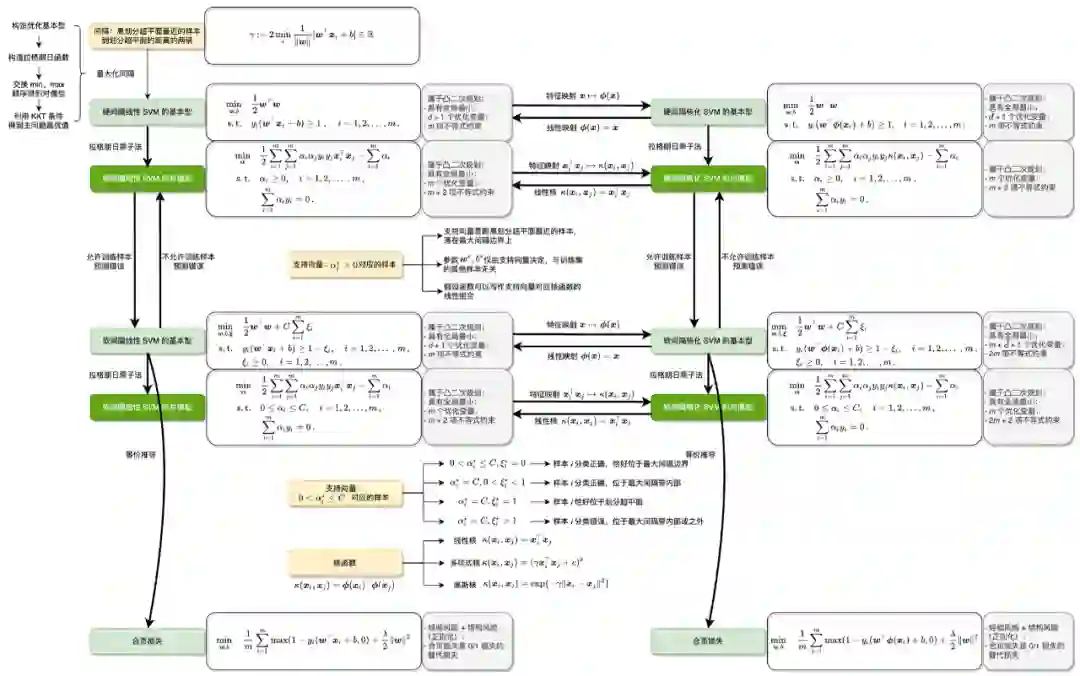 SVM 中涉及的关键内容可以用下图进行概括,本书将从最基础的部分进行,逐步深入,每一步都尽量提供详细的推导过程,使读者能跟上本书的节奏。