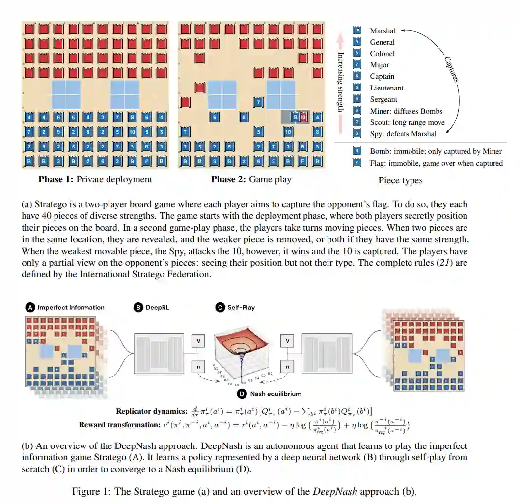自人工智能(AI)领域成立以来,其进展一直是通过对棋盘游戏的掌握来衡量的。棋盘游戏使我们能够衡量和评估人类和机器如何在受控环境中制定和执行战略。几十年来,提前计划的能力一直是人工智能在完美信息游戏(如国际象棋、跳棋、象棋和围棋)以及不完美信息游戏(如扑克和苏格兰场)中取得成功的核心。多年来,Stratego棋盘游戏已经构成了人工智能研究的下一个前沿领域之一。关于游戏阶段和游戏机制的可视化,见图1a。该游戏带来了两个关键的挑战。首先,Stratego的游戏树有10^535个可能的状态,这比无下限的德州扑克(一种经过充分研究的不完全信息)还要大。