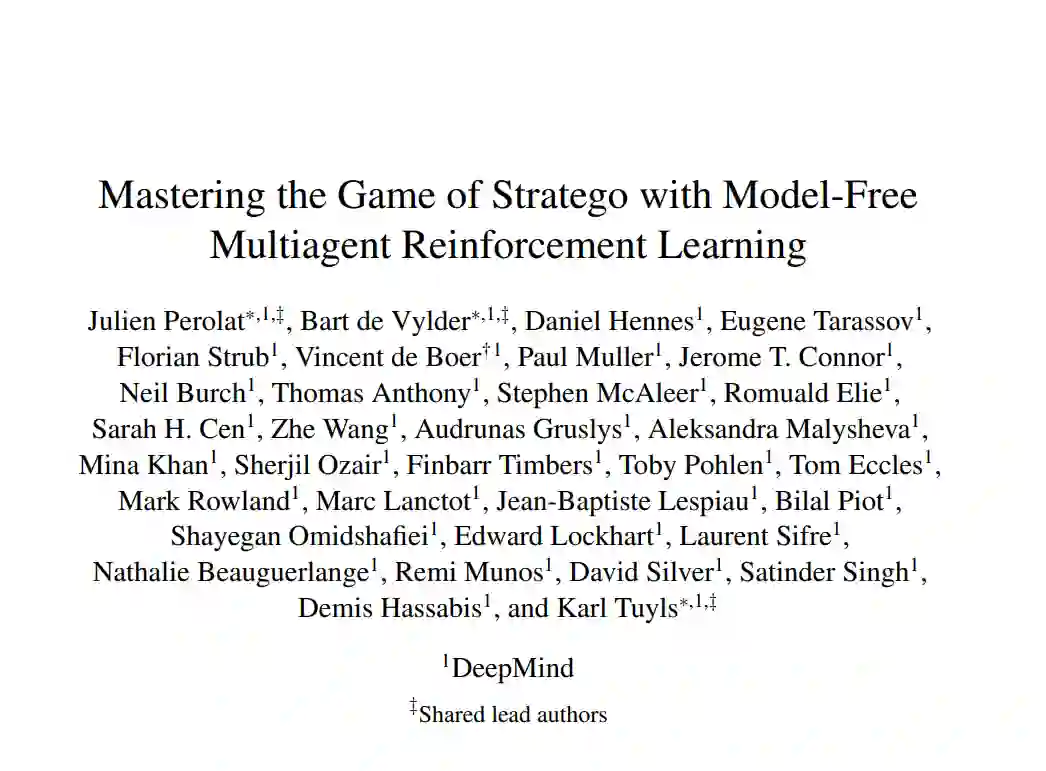 我们介绍DeepNash,它是一个自主智能体,能以人类专家的水平执行不完全信息博弈Stratego。Stratego是人工智能(AI)尚未掌握的少数标志性棋盘游戏之一。这是一个具有双重挑战的游戏:它需要像国际象棋那样的长期战略思考,但它也需要像扑克那样处理不完美的信息。支撑DeepNash的技术使用了一种基于博弈论、无模型的深度强化学习方法,没有搜索,它通过自我游戏从头开始学习掌握战略。DeepNash在Stratego中击败了现有的最先进的人工智能方法,并在Gravon游戏平台上取得了年初至今(2022年)和历史排名前三的成绩,与人类专家玩家竞争。