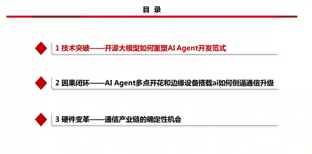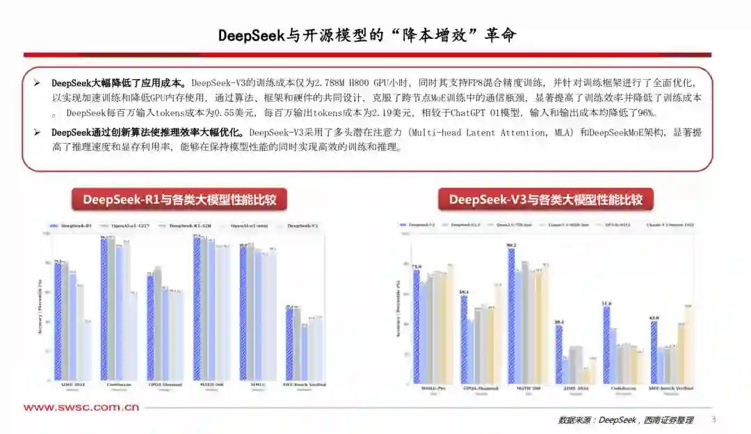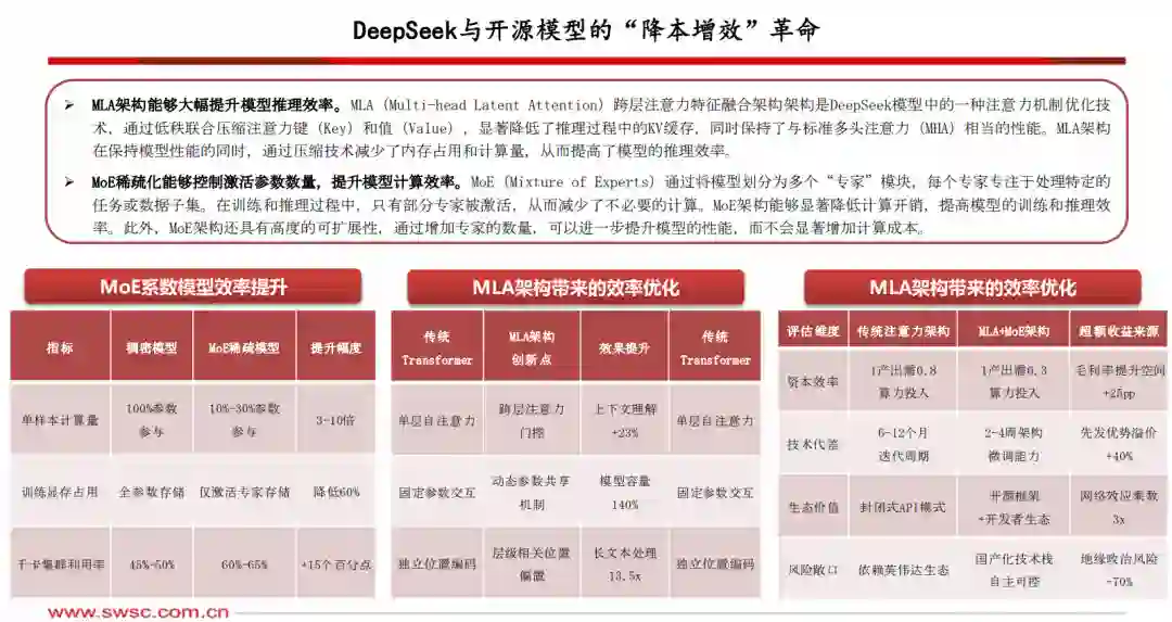 DeepSeek通过创新算法使推理效率大幅优化,大幅降低了应用成本。DeepSeek-V3的训练成本仅为2.788MH800GPU小时,同时其支持FP8混合精度训练,并针对训练框架进行了全面优化,以实现加速训练和降低GPU内存使用,通过算法、框架和硬件的共同设计,克服了跨节点MoE训练中的通信瓶颈,显著提高了训练效率并降低了训练成本。DeepSeek每百万输入tokens成本为0.55美元,每百万输出tokens成本为2.19美元,相较于ChatGPTO1模型,输入和输出成本均降低了96%。DeepSeek-V3采用了多头潜在注意力(Multi-head Latent Attention,MLA)和DeepSeekMoE架构,显著提高了推理速度和显存利用率,能够在保持模型性能的同时实现高效的训练和推理。 DeepSeek从成本端和技术端对垂类AI小模型(AIAgent)带来了直接催化。从成本端看,更低的推理成本降低了垂类AIAgent的开发成本,极大刺激了各行业的企业智能化需求。技术端看,Deepseek在自然语言理解、多模态交互等底层技术上的突破直接降低了垂直领域小模型的技术门槛,其开源的分布式训练框架等技术能够被小模型复用。同时,Deepseek的模型知识蒸馏等压缩技术使小模型既能继承大模型能力,又保持轻量化特性。对数据实时性敏感的垂类AIagent需要在感知端和云端快速传递数据,对低时延高带宽网络提出要求,同时小模型下沉到中小企业,进一步带来了网络通信基础设施需求,对交换机、边缘计算设备、5G切片等带来新需求。 光模块等需求来源从训练转向推理,带来多场景适配需求。虽然单次训练任务的算力需求降低,但模型轻量化可能推动分布式训练和边缘计算的普及,导致数据中心内部短距连接需求从集中式超算集群转向更分散的节点间通信。机架内光模块对于高密度计算仍需要低延迟、高带宽的互连,800G模块需求可能受分布式架构的推动;而在边缘场景,短距光模块在边缘服务器的部署比例可能上升,但单点用量低于传统超算中心。同时,技术替代效应强于需求收缩,CPO的核心价值在于解决传统可插拔光模块的功耗和密度瓶颈,即使算力需求下降,但对于能效比要求、空间压缩要求、降低成本要求仍可能驱动其渗透率提升。
