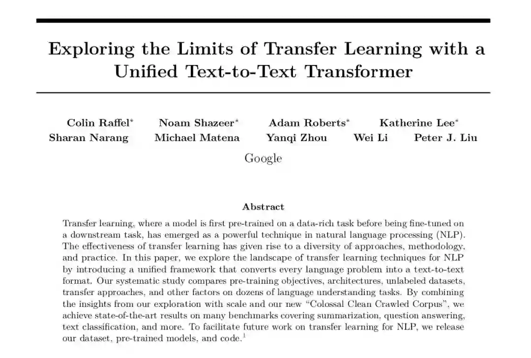 谷歌研究者在论文《使用统一的文本到文本的Transformer 来探索迁移学习的局限性》中,提出了一个大规模的实证评估,以确定哪些迁移学习技术效果最好,并大规模应用这些迁移学习技术来创建一个新模型,作者将这个新模型称之为文本到文本的迁移Transformer (Text-To-Text Transfer Transformer,T5)。与此同时,他们还引入了一个新的开源预训练数据集——Colossal Clean Crawled Corpus(C4)。 作者在C4数据集上对T5 模型进行预训练,让模型在许多 NLP 基准上都实现了最佳结果,与此同时还拥有足够的灵活性,进行微调后可应用到多个重要的下游任务上。