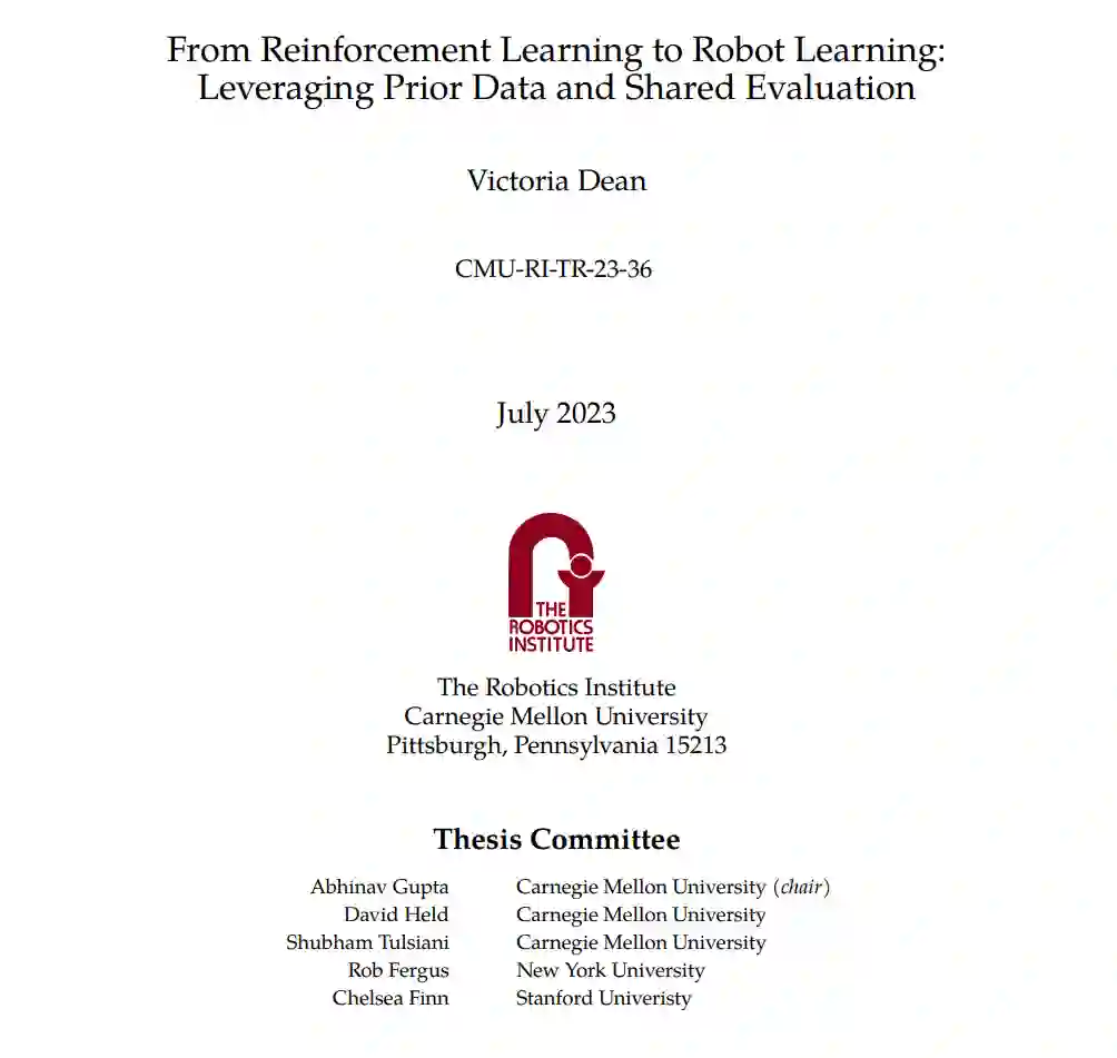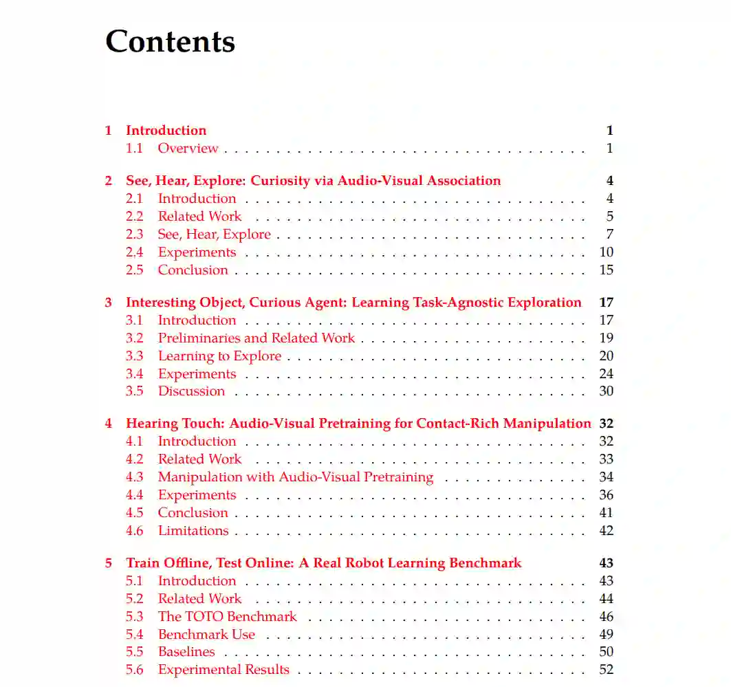 机器人学习范例的两个常见假设限制了数据效率。首先,一个代理通常假设独立的环境和没有先前的知识或经验 —— 学习是从零开始的。其次,代理通常只接收图像观察作为输入,仅依赖视觉来学习任务。但在现实世界中,人类在多个环境中通过多种感官学习,并在学习新任务时带有先前的经验。这种方法不仅是实际的,而且在实际的机器人技术中也是至关重要的,因为从部署的物理系统中收集大量样本在成本上是不切实际的。 在这篇论文中,我展示了一项工作,通过利用多模态和预训练来提高机器人学习的数据效率。首先,我展示了如何通过多模态感知,如视觉和听觉,提供丰富的自监督(第2章)。其次,我介绍了一个框架,用于预训练和评估通过环境转移的自监督探索(第3章)。在第4章中,我将这些想法应用于实际的操作,结合了大规模预训练和多模态的好处,通过音频-视频预训练来为接触式微型麦克风提供训练。最后,根据第3章的基准测试工作,我介绍了一个真实的机器人基准,用于通过共享数据和硬件评估视觉和策略学习方法的泛化能力(第5章)。
