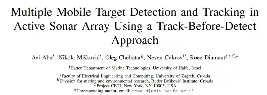 提出了一种利用主动声学传输宽带啁啾信号来探测和跟踪水下移动物体的算法,水听器阵列可接收这些信号的反射。该方法对接收到的反射序列采用先跟踪后检测的方法,从而克服了误报率高的问题。通过延迟和波束成形以及脉冲压缩,为从每个发射探头信号接收到的混响创建一个二维时空矩阵。通过二维恒定误报率(CFAR)检测器对结果进行过滤,以识别与潜在目标相对应的反射模式。多个探头发射的间隔较近的信号被组合成球状,以避免对单个目标的多次探测。使用近似等速(NCV)模型的 "先跟踪后检测 "方法可跟踪多个目标。位置和速度由去偏转换测量卡尔曼滤波器估算。对模拟场景和海上实验的结果进行了分析,海上实验是对贴有 GPS 标签的金头鲷鱼进行跟踪。与两个基准方案相比,结果显示了良好的跟踪连续性和准确性,而且对检测阈值的选择也很稳健。