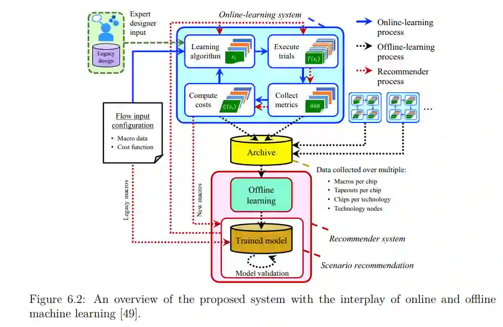 对于工业高性能处理器的LSPD,作者提出了一种新的协作推荐系统方法,从许多用户(系统)和项目(旋钮配置)的互动(CAD运行)中学习隐藏特征。为了应对 "二重性 "的诅咒,项目特征被分解为项目属性(旋钮)的特征。综合模型预测了每个用户-项目对的QoR。对于特定应用的加速器的HLS,提出了一系列神经网络模型,其演化顺序为所提出的混合共享转移学习模型。转移学习的目的是利用从以前的问题中获得的知识;然而,由于系统和旋钮的异质性,该模型需要区分哪一块知识应该被转移。所提出的ML方法旨在不仅像设计师那样使用经验知识,而且最终通过提供替代性的见解和建议新系统的优化可能性来帮助设计师。作为这个方向的努力,我开发了一个人工智能增强的DSE工具,利用上述模型,为新的目标系统生成推荐的旋钮配置。通过这项研究,我调查了下一代人工智能增强的DSE的潜力,目的是促进CAD社区的安全协作工程,而不需要分享机密信息和知识产权。