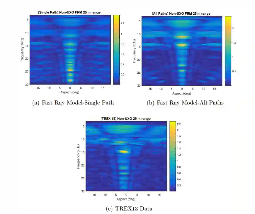 图 2.4:使用 LSAS 模型生成的非未爆炸物体声学颜色图与 TREX 数据对比。