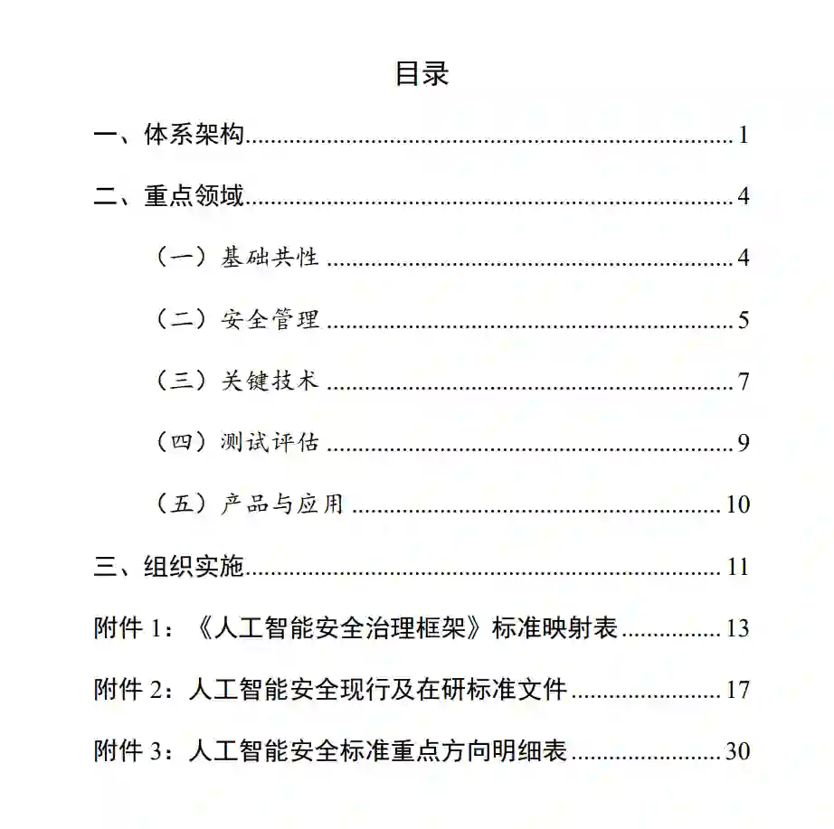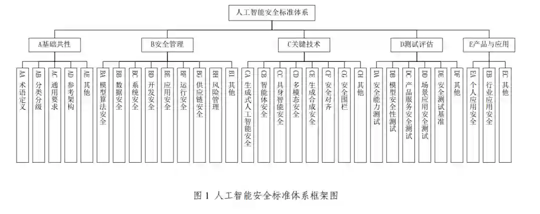 人工智能安全标准体系旨在支撑落实《人工智能安全治 理框架》(以下简称“《框架》”),围绕《框架》中明确 的模型算法安全、数据安全、系统安全三类内生安全风险, 以及网络域、现实域、认知域、伦理域四类应用安全风险, 系统梳理了可帮助防范化解相关人工智能安全风险的重点 标准,同时与网络安全国家标准体系进行有效衔接,加强人 工智能安全标准工作顶层设计,以科学、合理的标准布局前 瞻应对各类风险挑战,促进人工智能技术及应用健康发展。 体系内各项标准与《框架》中各类风险的映射关系见附件 1。 人工智能安全标准体系主要由基础共性、安全管理、关 键技术、测试评估、产品与应用等 5 个部分组成,体系框架 如图 1 所示。 1、基础共性类标准是以标准工作支撑落实《框架》的 重要保障,主要规范了人工智能安全术语定义、分类分级、 通用要求、参考架构等方面内容,是人工智能安全的基础性、 总体性标准。 2、安全管理类标准围绕《框架》中明确的模型算法安 全、数据安全、系统安全三类内生安全风险,以及在人工智 能系统开发、应用、运行、维护等生命周期各环节面临的安 全风险,提供了覆盖全过程全要素的安全管理标准。 3、关键技术类标准紧扣人工智能相关技术发展情况, 主要规范了生成式人工智能安全、智能体安全、具身智能安全、多模态安全、生成合成安全、安全对齐、安全围栏等方 面内容,为人工智能技术健康发展保驾护航。 4、测试评估类标准主要规范人工智能安全能力测试、 模型安全性测试、产品服务安全测试、场景应用安全测试、 安全测试基准等方面内容,以测试评估工作帮助提升人工智 能安全水平。 5、产品与应用类标准主要规范个人应用、重点行业应 用等方面内容,保障人工智能技术在各行业、各领域的安全 应用。