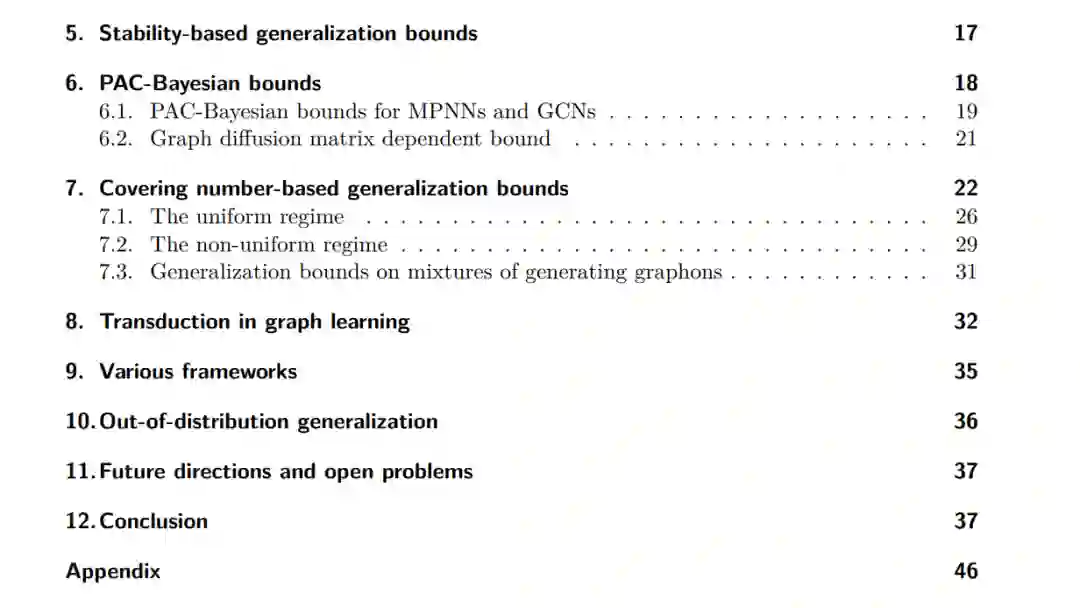 本文综述了关于MPNNs泛化能力的理论结果,旨在使不同结果之间的比较更加容易,并帮助读者快速进入该领域。我们基于VC维度、Rademacher复杂度、覆盖数界限、基于稳定性的泛化界限和PAC-Bayesian分析,综述了泛化结果。此外,我们还探讨了使用图论理论的泛化分析以及节点级预测任务和分布外泛化的泛化理论。我们的讨论涵盖了用于建立这些界限的数学工具及其依赖的理论基础。本综述的主要目标是为读者提供关于MPNNs泛化能力的全面概述,并为扩展当前理论以填补文献空白提供见解。此外,我们提出了该领域的开放问题和未来挑战,以促进未来的研究工作。