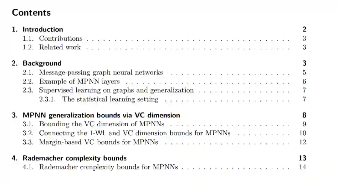 图模型在生命科学、自然科学和形式科学中用于描述实体之间的交互关系,例如原子系统 [Duval et al., 2023, Zhang et al., 2023] 或社交网络 [Easley and Kleinberg, 2010, Lovász, 2012],这凸显了机器学习方法处理图结构数据的必要性。因此,专为图结构数据设计的神经网络,主要是消息传递图神经网络(MPNNs)[Merkwirth and Lengauer, 2005, Gori et al., 2005, Hamilton et al., 2017, Kipf and Welling, 2017, Gilmer et al., 2017, Scarselli et al., 2009],在机器学习社区中获得了广泛关注,并在多个领域展示了显著成果 [Corso et al., 2024],涵盖药物设计 [Wong et al., 2023]、全球中程天气预报 [Lam et al., 2023] 和组合优化 [Cappart et al., 2021, Gasse et al., 2019, Qian et al., 2023]。 尽管MPNNs在实践中取得了成功并产生了实际影响,但其理论性质的研究相对较少 [Morris et al., 2024]。目前,MPNNs的表达能力已得到一定程度的理解。MPNNs的表达能力主要通过两种数学方法建模:与一维Weisfeiler-Leman算法(1-WL)的算法对齐和通用逼近定理 [Azizian and Lelarge, 2021, Böker et al., 2023, Chen et al., 2019, Geerts and Reutter, 2022, Maehara and NT, 2019, Rauchwerger et al., 2024]。其中,1-WL [Weisfeiler and Leman, 1968, Weisfeiler, 1976, Morris et al., 2021] 是图同构问题中一种被广泛研究的启发式算法。具体而言,Morris et al. [2019a] 和 Xu et al. [2019a] 表明,1-WL限制了任何可能的MPNN架构在区分非同构图方面的表达能力。 相比之下,关于MPNNs在训练数据之外做出有意义预测的能力,研究较少。更准确地说,MPNNs的泛化能力评估了架构在适应来自训练集相同分布的新图数据时的有效性。此外,外推或分布外泛化涉及从与训练集(略微)不同的分布中抽取的未见图数据。目前,已有多种理论框架用于分析MPNNs的泛化能力,例如Vapnik-Chervonenkis维度(VC维度)[Morris et al., 2023, Scarselli et al., 2018]、Rademacher平均值 [Garg et al., 2020] 及相关形式化方法。然而,由于不同的假设、MPNN架构和参数,这些结果往往难以直接比较。