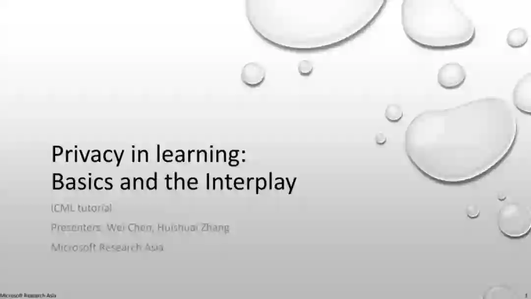 在现实世界中,越来越多的客户在使用人工智能服务时将隐私视为一个问题,尤其是当客户内容包含敏感数据时。最近的研究表明,像GPT-2这样的大型语言模型可以记忆内容,这些内容可以被对手提取出来。当模型在客户数据上接受训练时,这在部署场景中带来了很高的隐私风险。由于其数学上的严密性,差分隐私被广泛认为是隐私保护的黄金标准。为了缓解机器学习中对隐私的担忧,许多研究工作都在研究具有不同隐私保障的机器学习。现在是时候澄清不同隐私下学习的挑战和机会了。在本教程中,我们首先描述了机器学习模型中潜在的隐私风险,并介绍了差分隐私的背景,然后介绍了在机器学习中保障差分隐私的流行方法。在接下来的教程中,我们强调学习和隐私之间的相互作用。在第二部分中,我们展示了如何利用学习属性来提高隐私学习的效用,特别是利用数据点之间的相关性和深度学习模型的低秩属性来解决这些挑战的最新进展。在第三部分,我们提出了研究的另一个方向,即利用差分隐私的工具来解决经典的泛化问题,并给出了利用差分隐私的思想来抵抗机器学习攻击的具体场景。